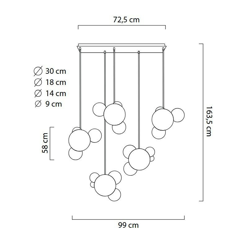 Elegáns, modern függőlámpa öt üveggömbből álló kompozícióval, amely a buborékok játékos könnyedségét idézi. Az arany részletek és LED világítás tökéletes egyensúlyt teremt a funkcionalitás és a design között.