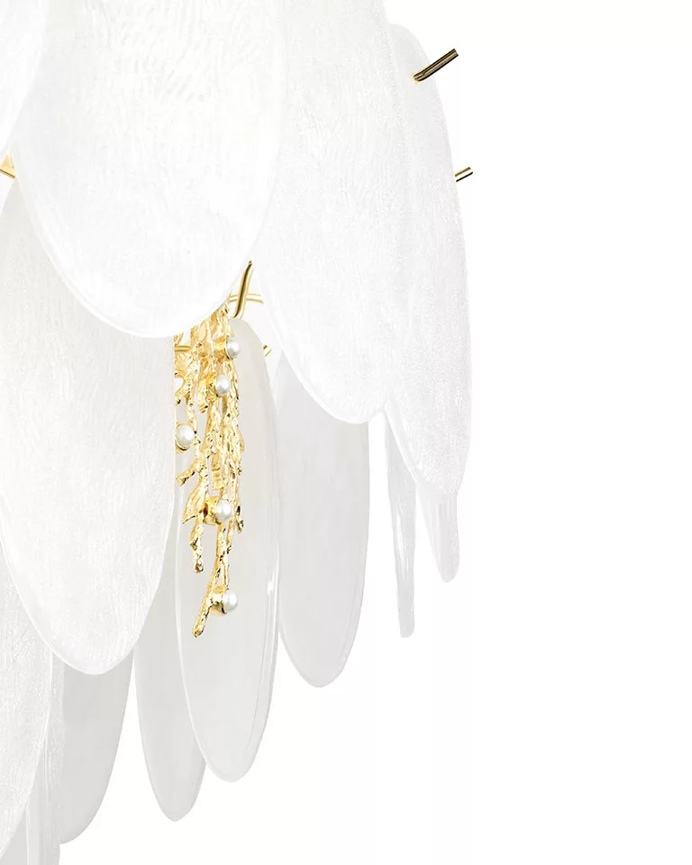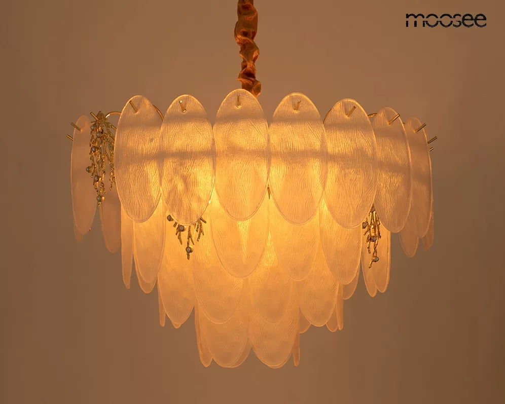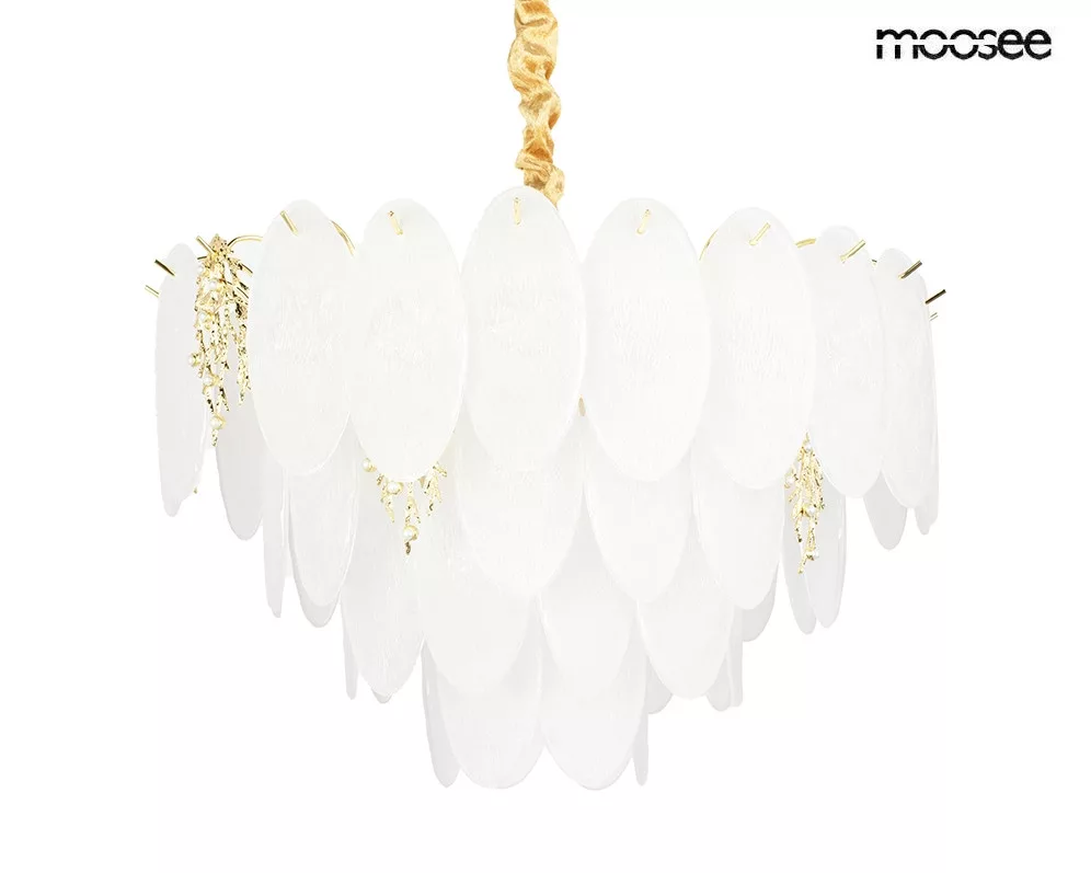 A MOOSEE Clara 80 függőlámpa egy lenyűgöző világítótest, amely ötvözi a modern dizájnt a klasszikus eleganciával. A fehér üveg és arany fém kombinációja különleges fényjátékot teremt, míg a művészi kialakítású lámpaernyők harmonikus egységet alkotnak.