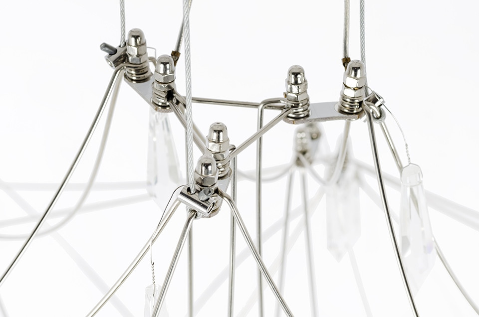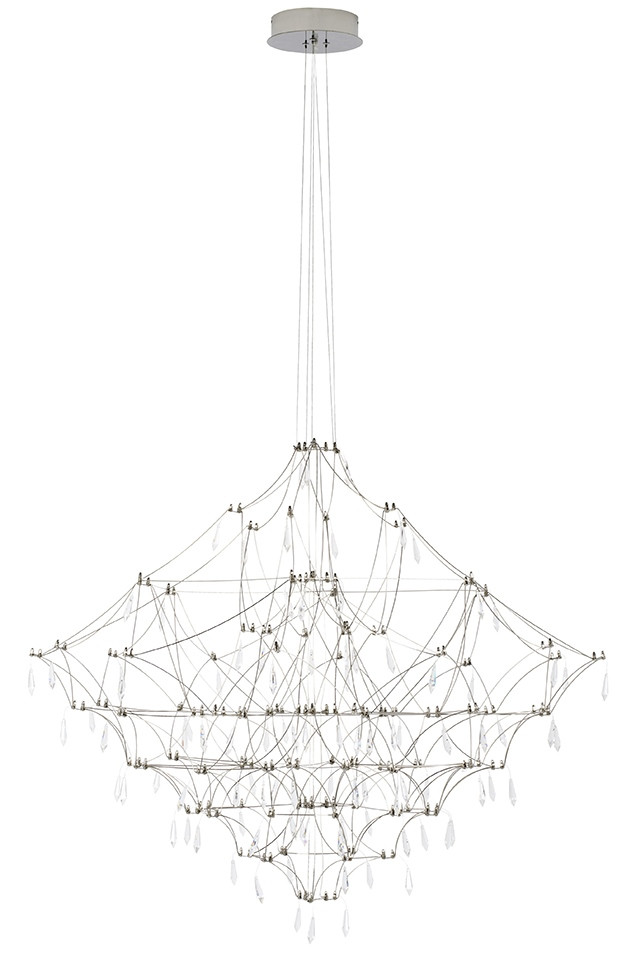 A Constellation 77 függőlámpa egy lenyűgöző világítótest, amely ötvözi a modern technológiát és az időtlen eleganciát. A szálcsiszolt acélból készült pókháló szerű szerkezet és a kristály díszítések tökéletes harmóniában egyesülnek, létrehozva egy egyedülálló fényinstallációt.
