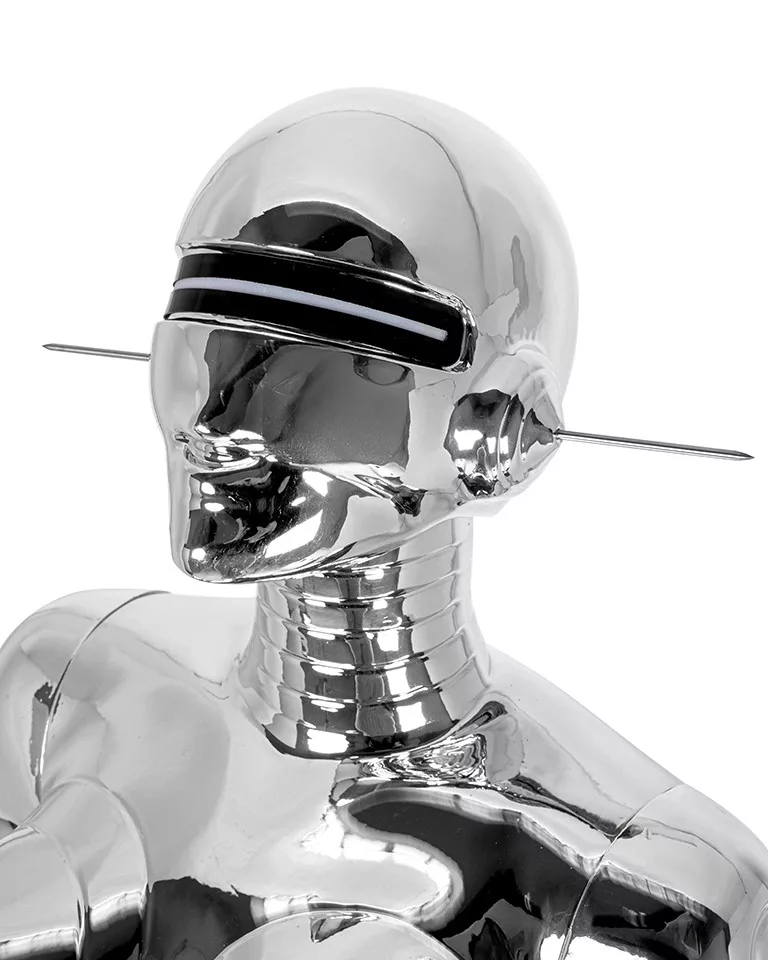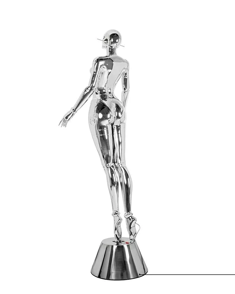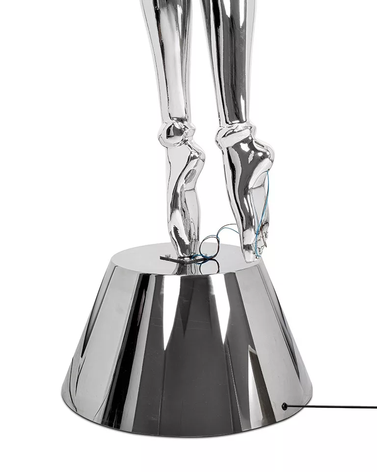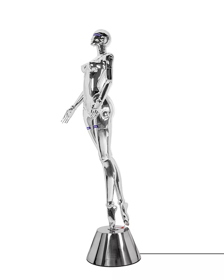 A Cyber Woman Stand állólámpa a modern design és technológia tökéletes ötvözete. A tükörfényes króm felületű szobor nem csupán szemet gyönyörködtető látványelem, hanem innovatív világítási megoldás is egyben. A beépített kék LED-ek finoman világítják meg a formát, sci-fi hangulatot teremtve a térben.