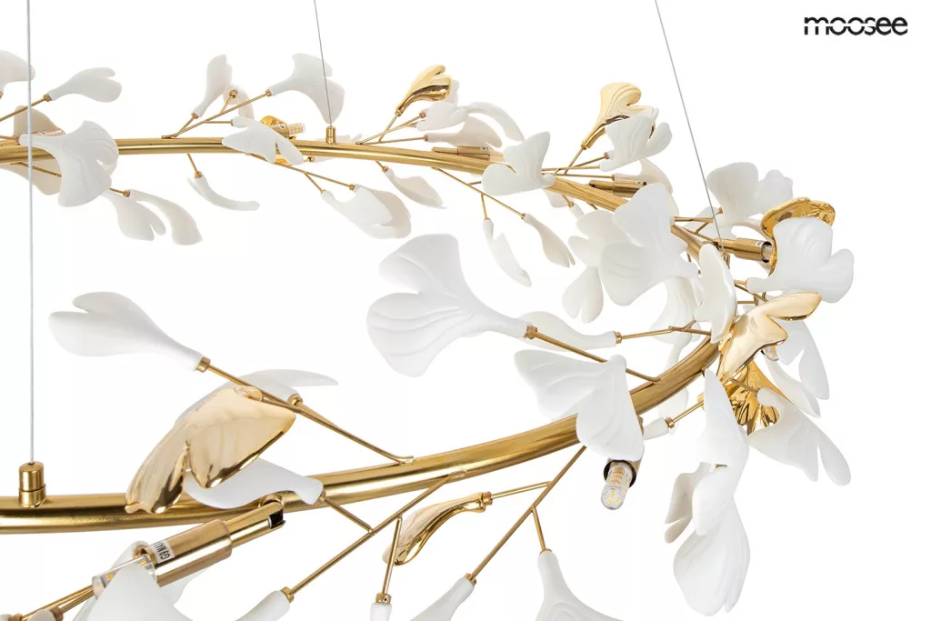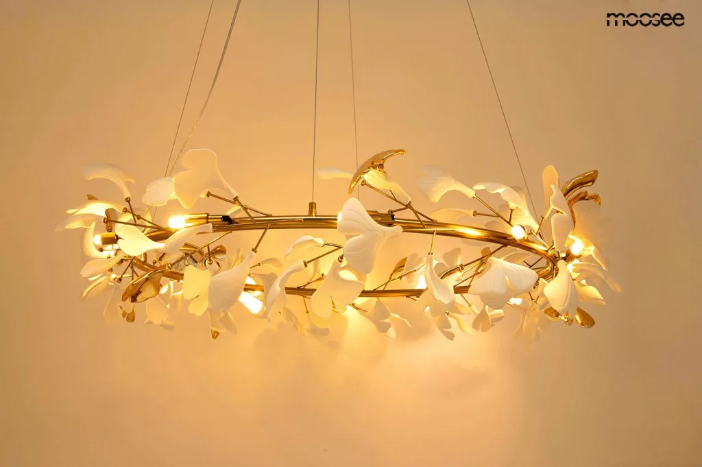 A MOOSEE Flora függőlámpa a természet szépségét hozza el otthonába. Az arany színű, ágakat idéző vázon finoman elhelyezett fehér kerámia virágszirmok tökéletes harmóniát alkotnak, létrehozva egy lenyűgöző fényforrást, amely egyszerre világítótest és művészi installáció.