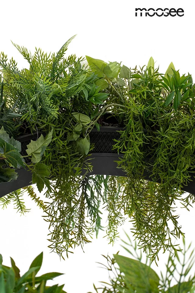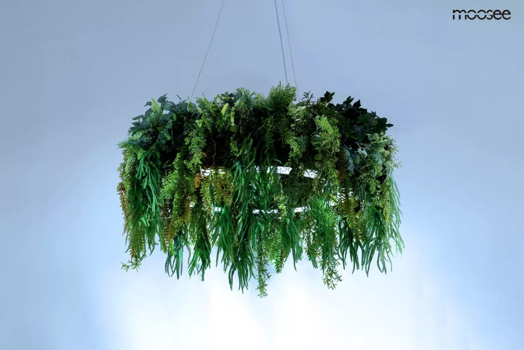 A MOOSEE Gardens függőlámpa tökéletesen ötvözi a modern világítástechnikát a természet szépségével. A fekete gyűrűn elhelyezett dús zöld műnövények élettel töltik meg a teret, miközben a beépített LED világítás három különböző színhőmérséklettel gondoskodik a megfelelő fényviszonyokról.