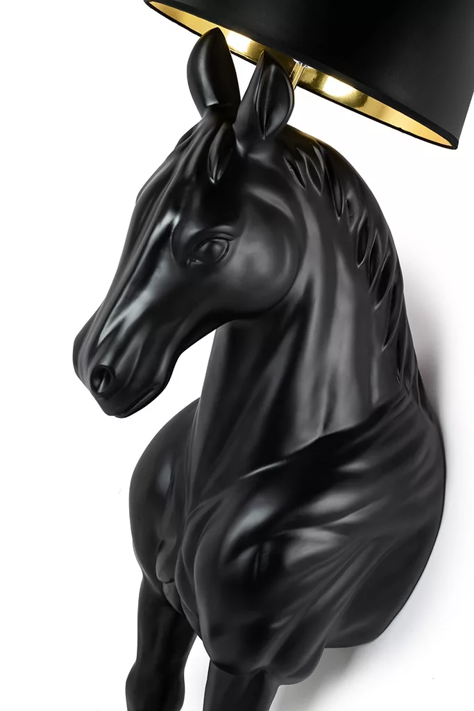 Elegáns, ló alakú állólámpa fekete üvegszálból, arany belső árnyékolóval és márvány talpazattal. Egyedi és extravagáns dizájn elem bármely térbe.