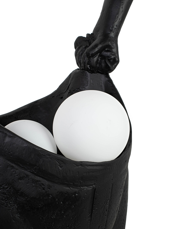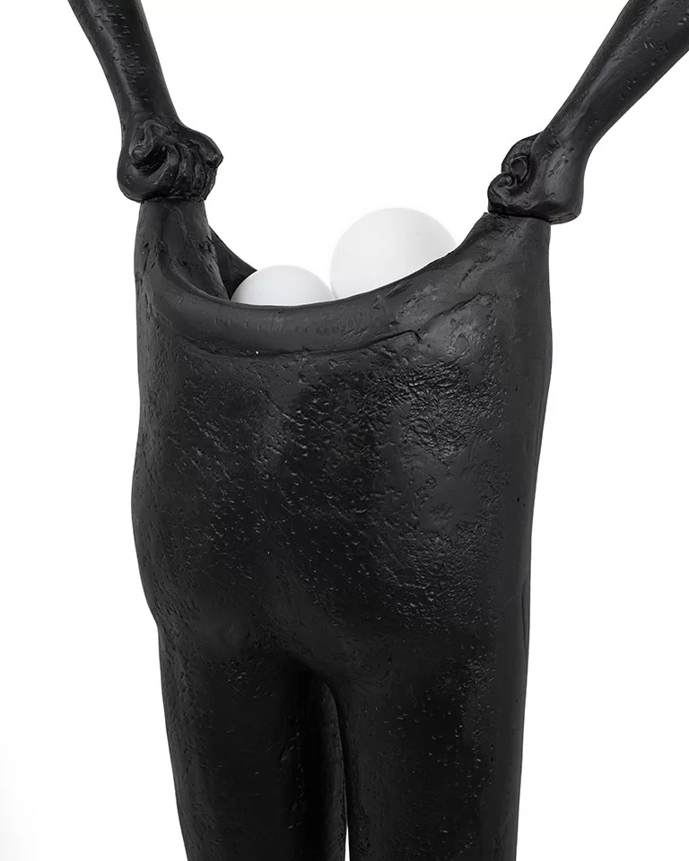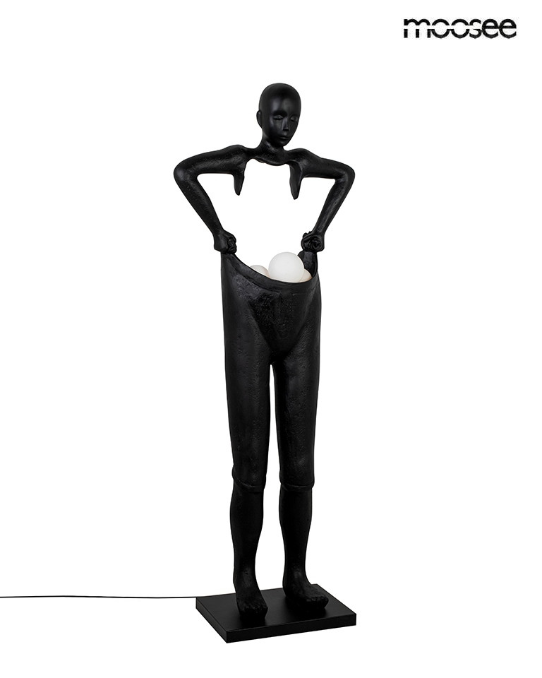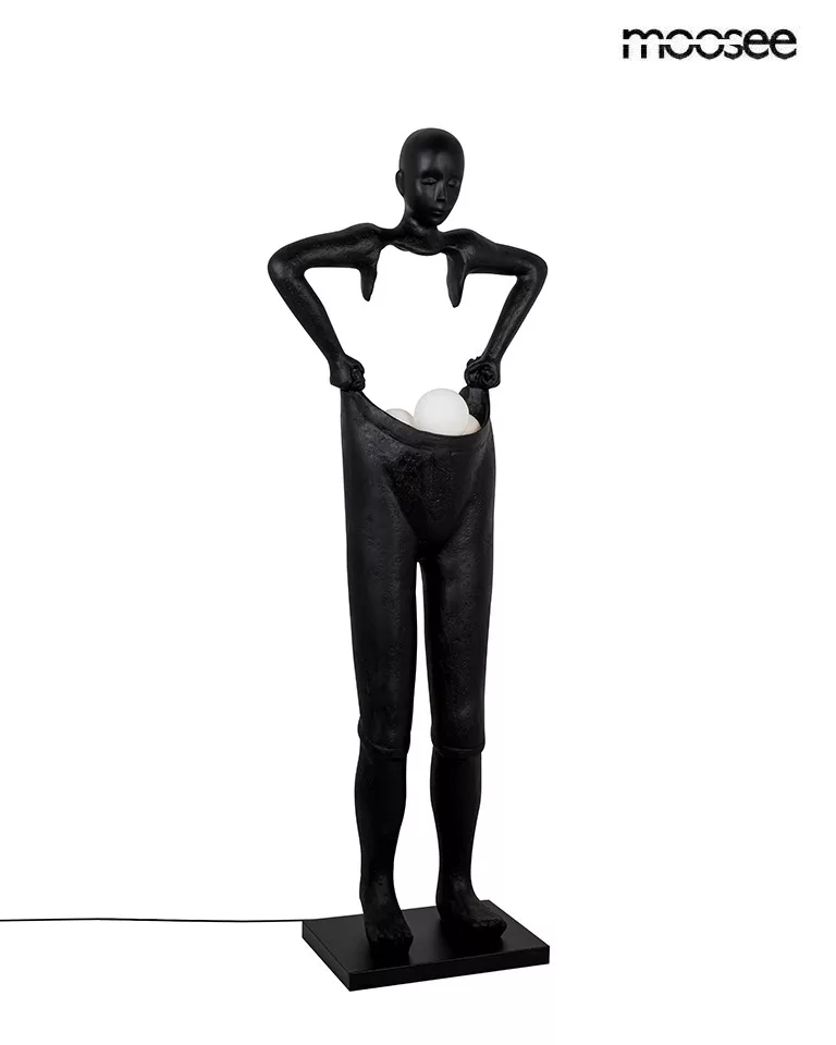 A MOOSEE Human Houdini állólámpa egy kivételes darab, amely egyesíti a szobrászat és a világítástechnika elemeit. Az üvegszálból készült emberi alakot formázó lámpatest elegáns fekete színben pompázik, míg a „nadrágban" elrejtett üveg lámpabúrák játékos fényjátékot varázsolnak környezetükbe.