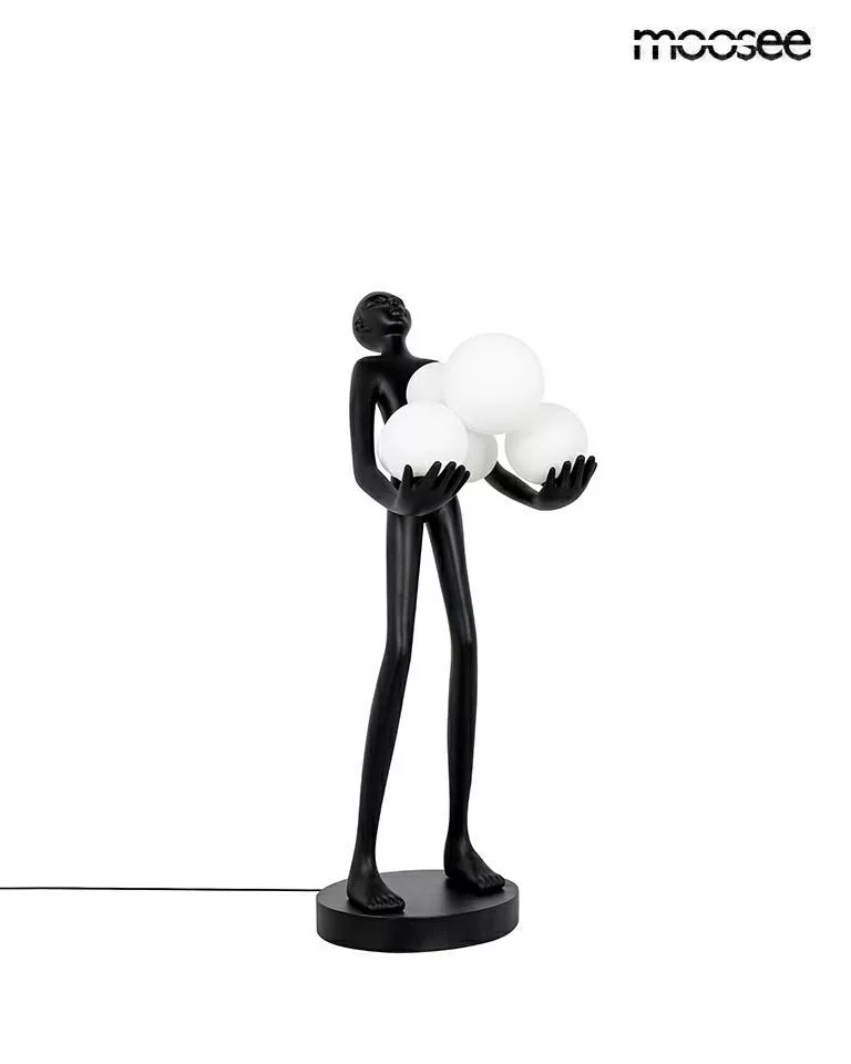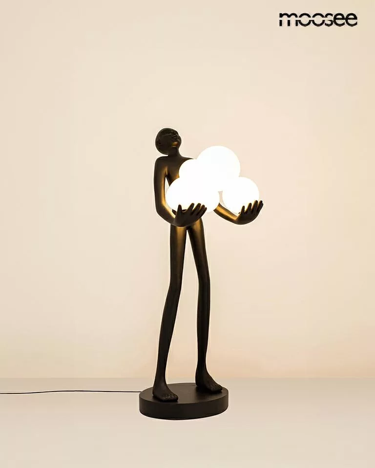A MOOSEE Human Premium asztali lámpa egy igazi művészeti alkotás, amely forradalmasítja a hagyományos világítási megoldásokat. A fekete üvegszálból készült karcsú figura három különböző méretű fehér üveggömböt tart, amelyek nem csupán fényforrásként szolgálnak, hanem dekoratív elemként is működnek.