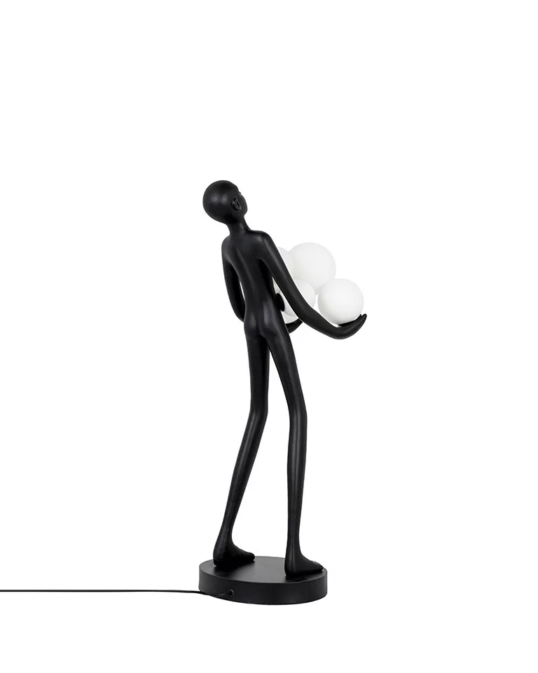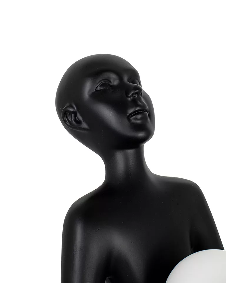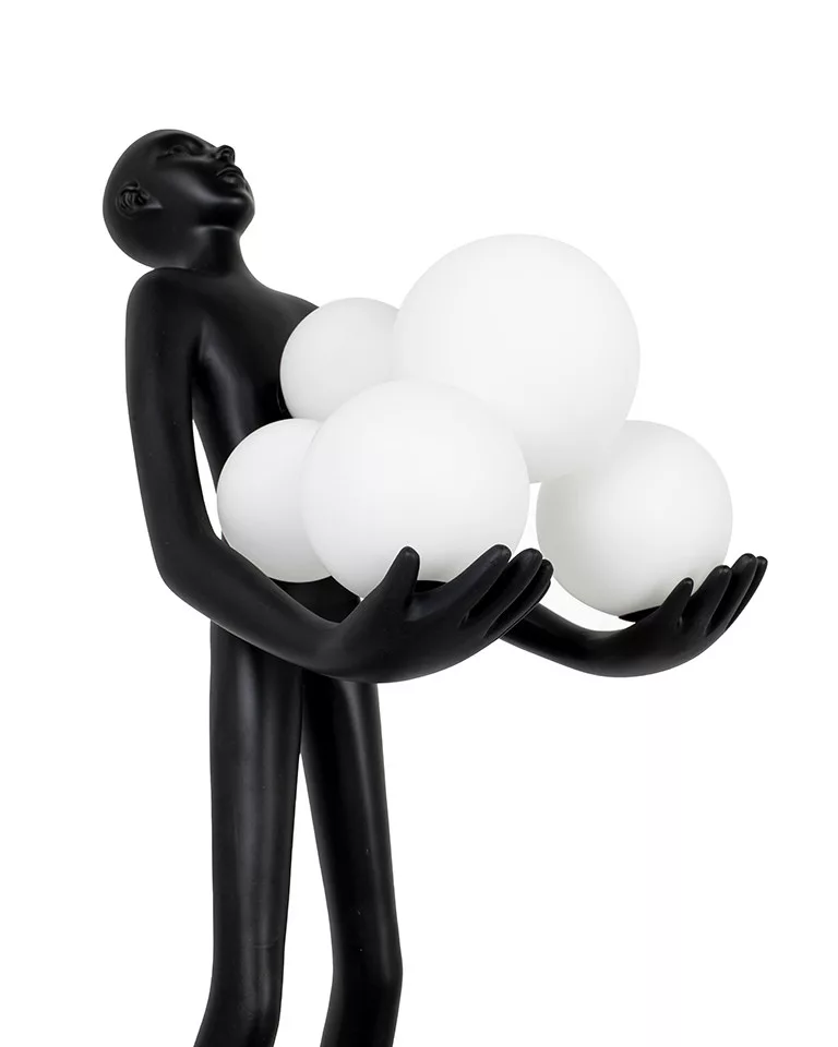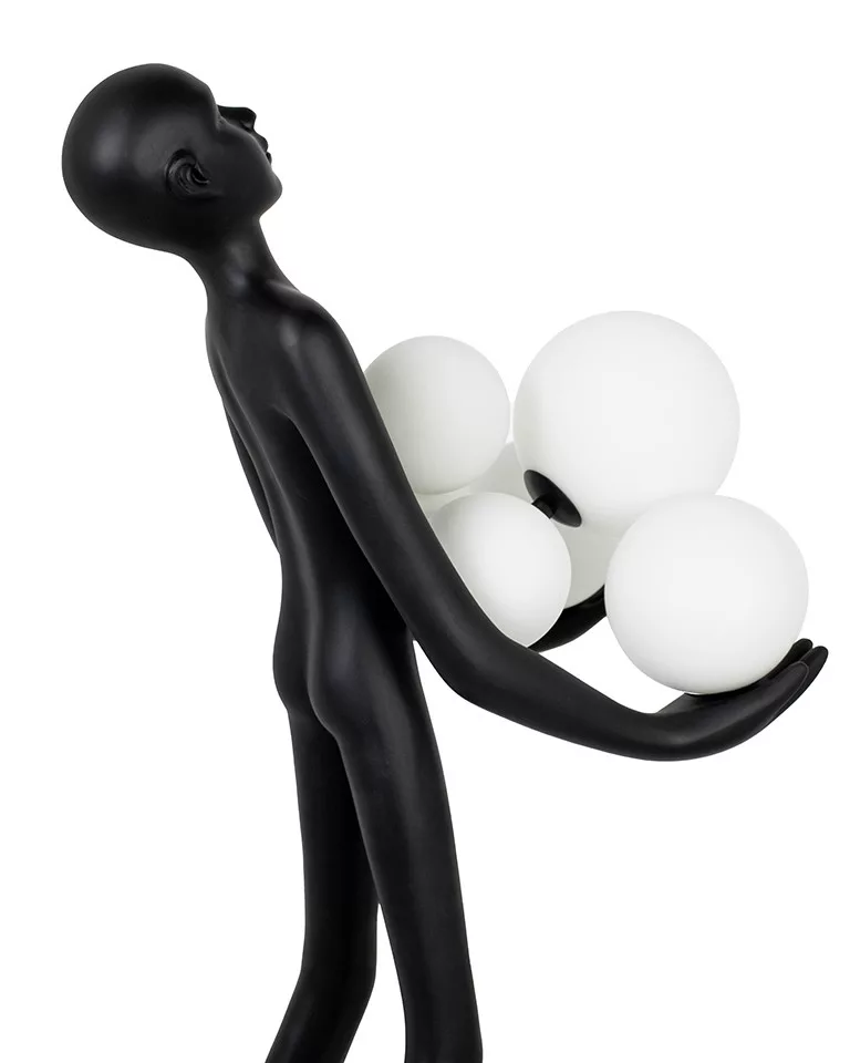 Egyedi művészi asztali lámpa, amely ötvözi a modern világítástechnikát és a kortárs designt. A fekete üvegszálas figura három elegáns fehér üveggömböt tart, amely különleges fényjátékot teremt.