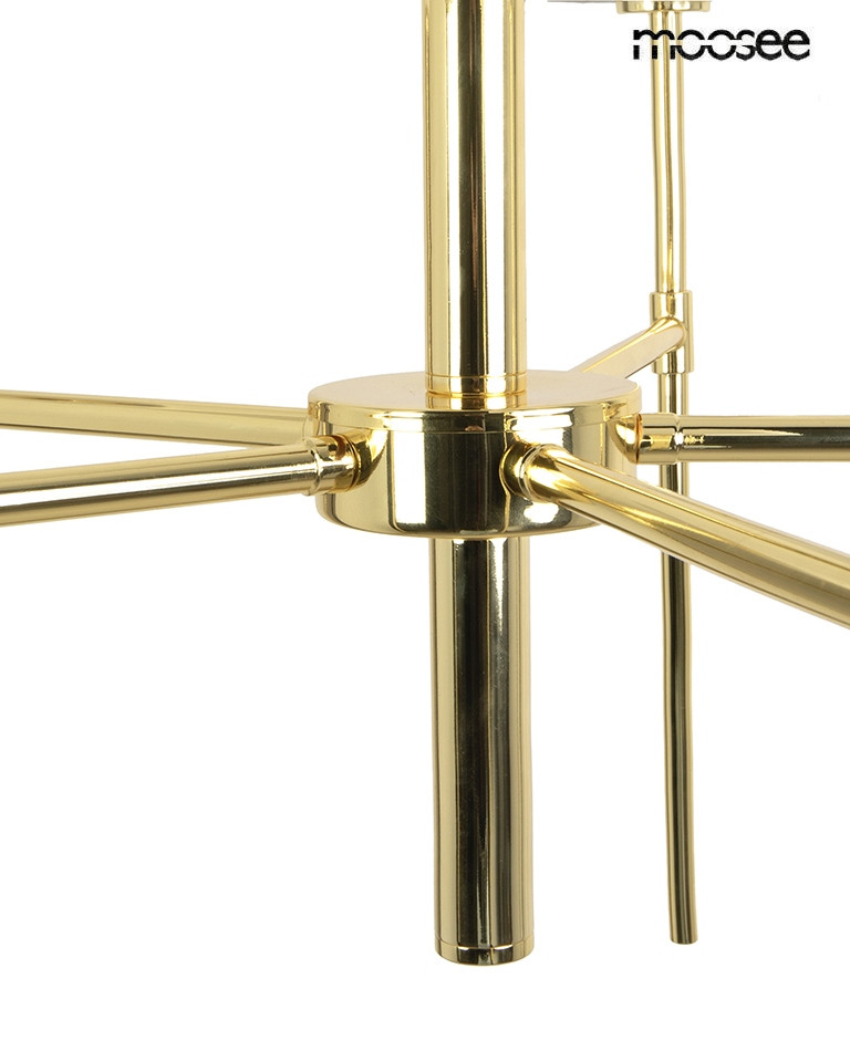A MOOSEE Imperio 5 függőlámpa a kifinomult design és praktikus funkcionalitás tökéletes ötvözete. Az aranyozott fém váz és a fehér burák harmonikus kontrasztja azonnal magára vonzza a tekintetet, míg az öt különálló fényforrás optimális megvilágítást biztosít.