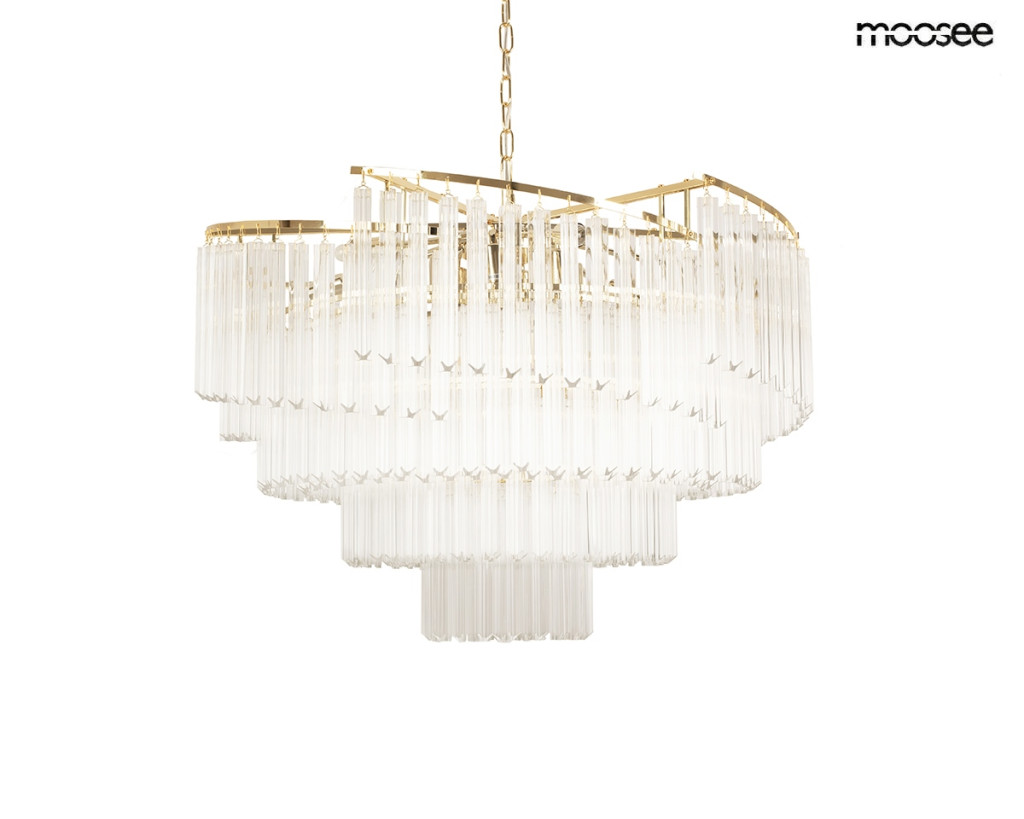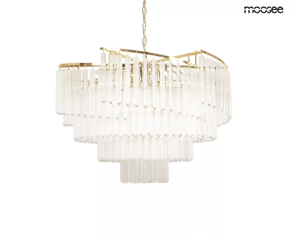 A MOOSEE LUMA 80 függőlámpa a modern luxus megtestesítője. A többszintes kialakítású kristály üvegrudak és az arany színű fém váz együttese káprázatos fényjátékot teremt, miközben elegáns látványelemként szolgál. A lámpa 15 E14-es izzóval szerelhető, így garantálva a tökéletes megvilágítást.