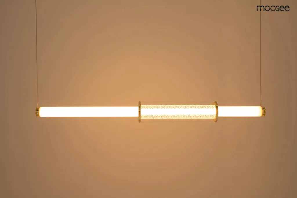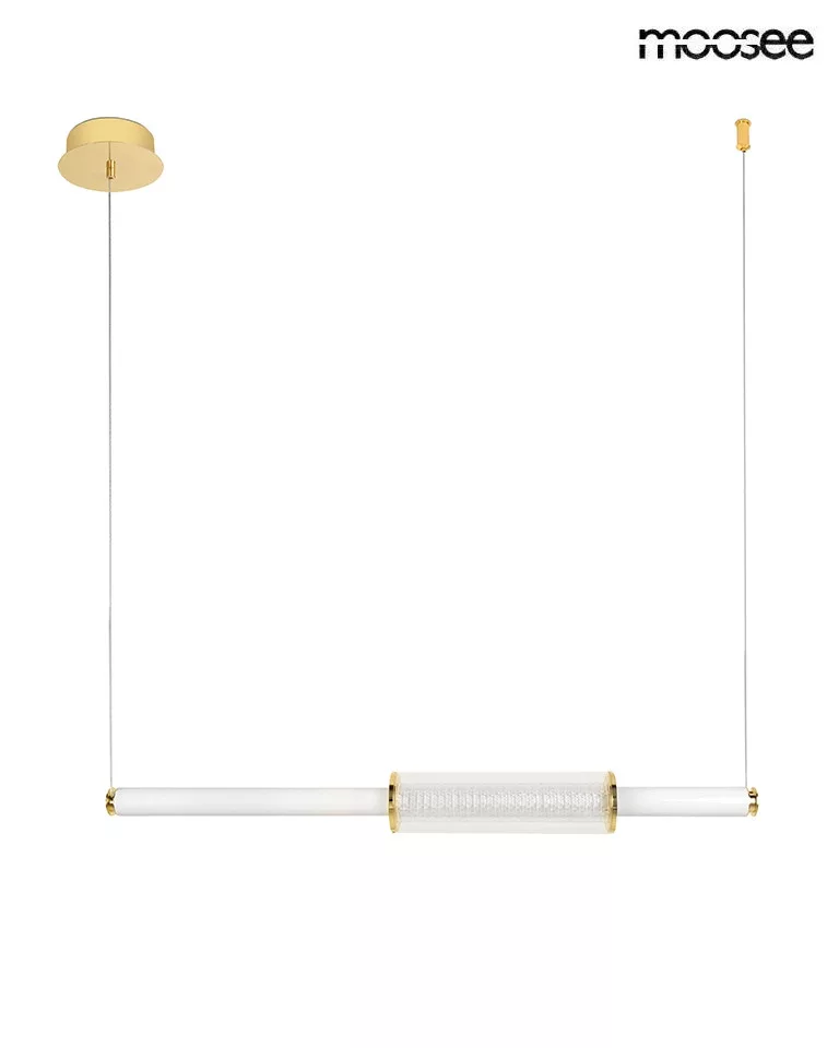 A MOOSEE Libra függőlámpa a modern világítástechnika és az időtlen design tökéletes ötvözete. Az arany színű fém elemek és a minőségi üveg harmonikus kombinációja egyedi megjelenést kölcsönöz a lámpának. A letisztult vonalvezetés és a prémium anyaghasználat teszi különlegessé ezt a világítótestet.