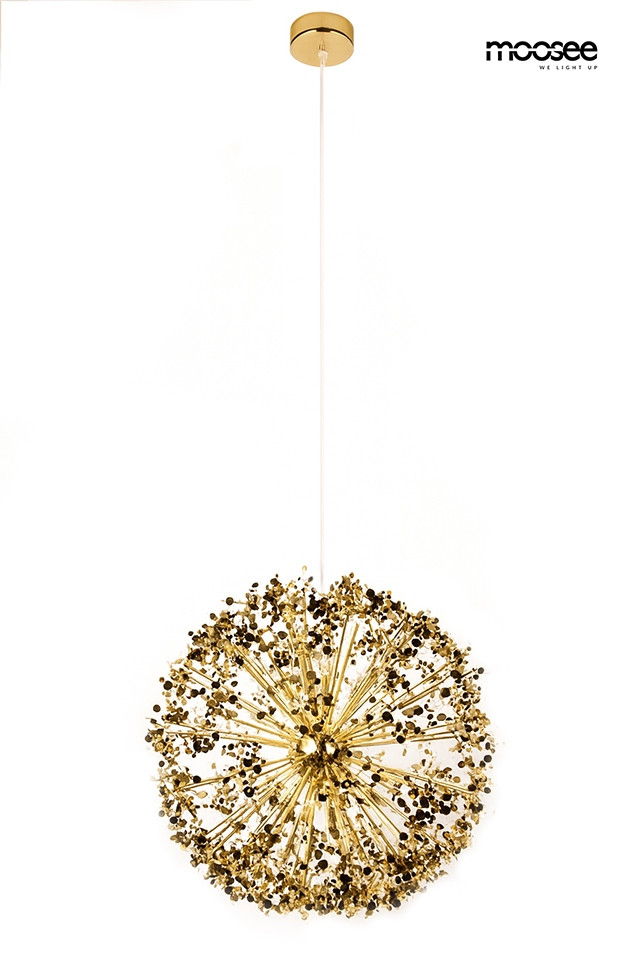 A MOOSEE MONETE 50 függőlámpa egyedi, dekoratív formájával azonnal magára vonja a tekintetet. A konstrukció egy fényrobbanásra vagy kifejlett pitypang virágra emlékeztet, amely modern eleganciát kölcsönöz minden térnek. Az 50 cm átmérőjű lámpatest számos fényes, arany színű elemből áll, amelyek lenyűgöző fény- és árnyékjátékot teremtenek a mennyezeten és a falak mentén.