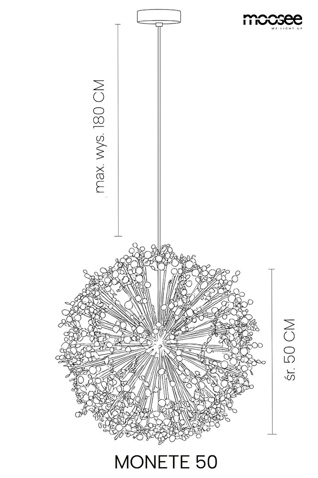 A masszív fém konstrukció tartósságot és stabilitást garantál, miközben a 12 G9-es foglalatnak köszönhetően erőteljes, mégis hangulatos megvilágítást biztosít. Ideális választás nappaliba, étkezőbe vagy reprezentatív előtérbe, ahol központi díszítő elemként funkcionál. A MONETE 50 nemcsak nappal gyönyörködtet látványával, hanem este különösen elbűvölő, amikor meleg, atmoszférikus fényt áraszt szét a térben.