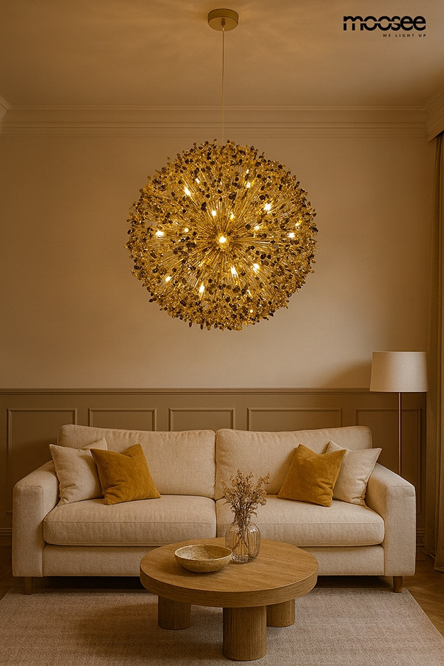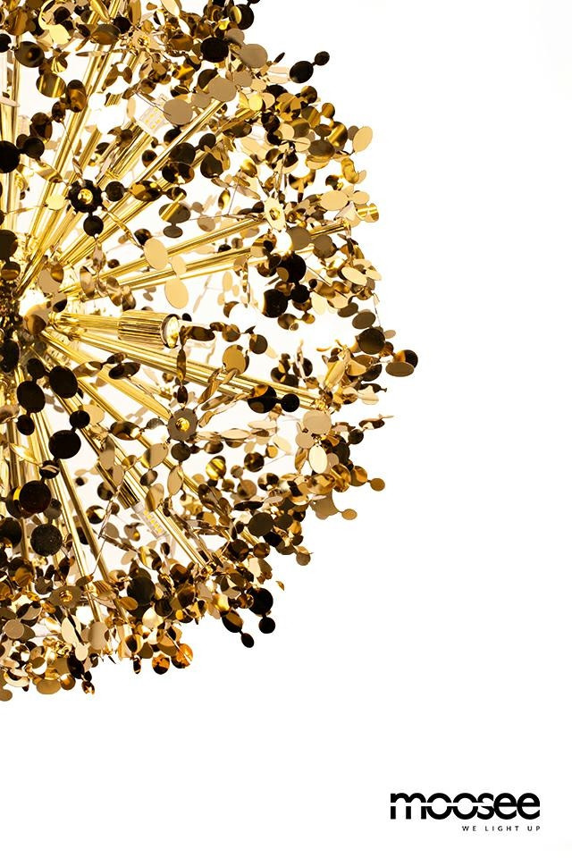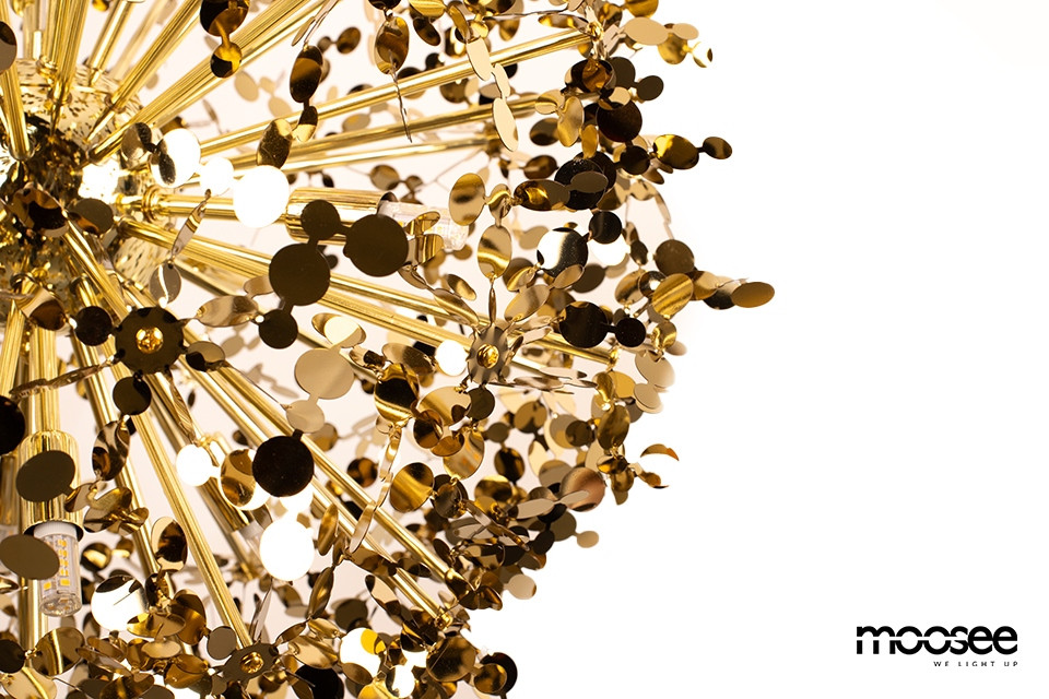 A MOOSEE MONETE 65 függőlámpa igazi ékszer a világítás világában. Több száz lüktető, arany színű elem alkotja ezt a háromdimenziós, robbanásszerű formát, amely mind bekapcsolt, mind kikapcsolt állapotban lenyűgöző látványt nyújt. A 65 cm átmérőjű gömb alakú klosz szobrászati expresszivitással párosul, és azonnal magára vonja a tekintetet bármely térben.