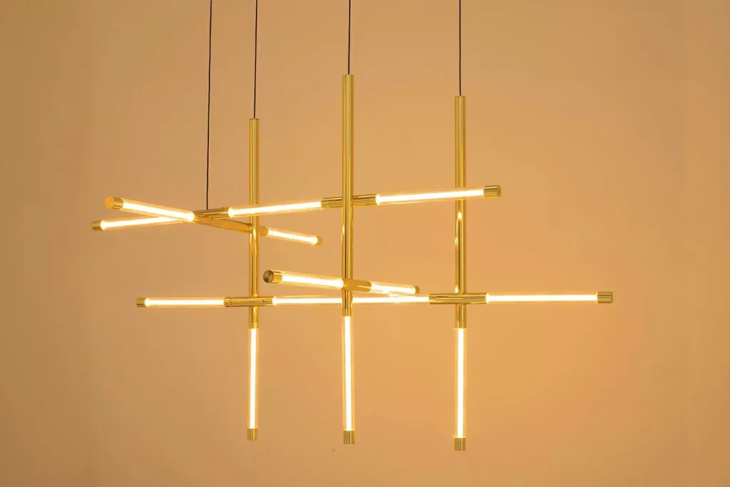 A Mikado S függőlámpa a modern világítástechnika és a kifinomult design találkozása. A kereszteződő átlátszó üveg és arany fém rudak légies, háromdimenziós szerkezetet alkotnak, amely egyszerre nyújt dekoratív látványt és optimális megvilágítást.