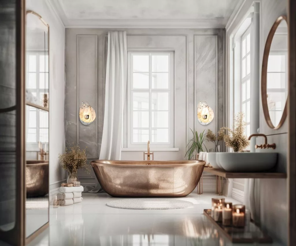 Elegáns, márványhatású fali lámpa modern arany részletekkel, amely tökéletes egyensúlyt teremt a klasszikus és kortárs design között.