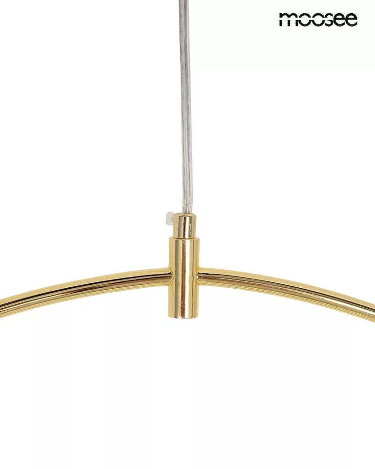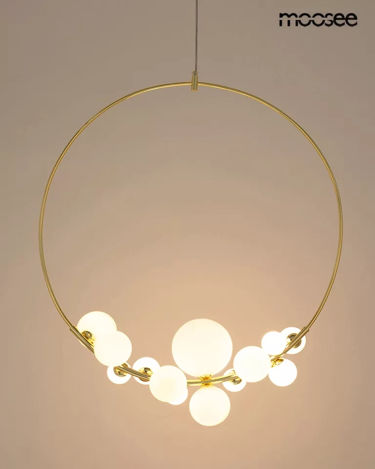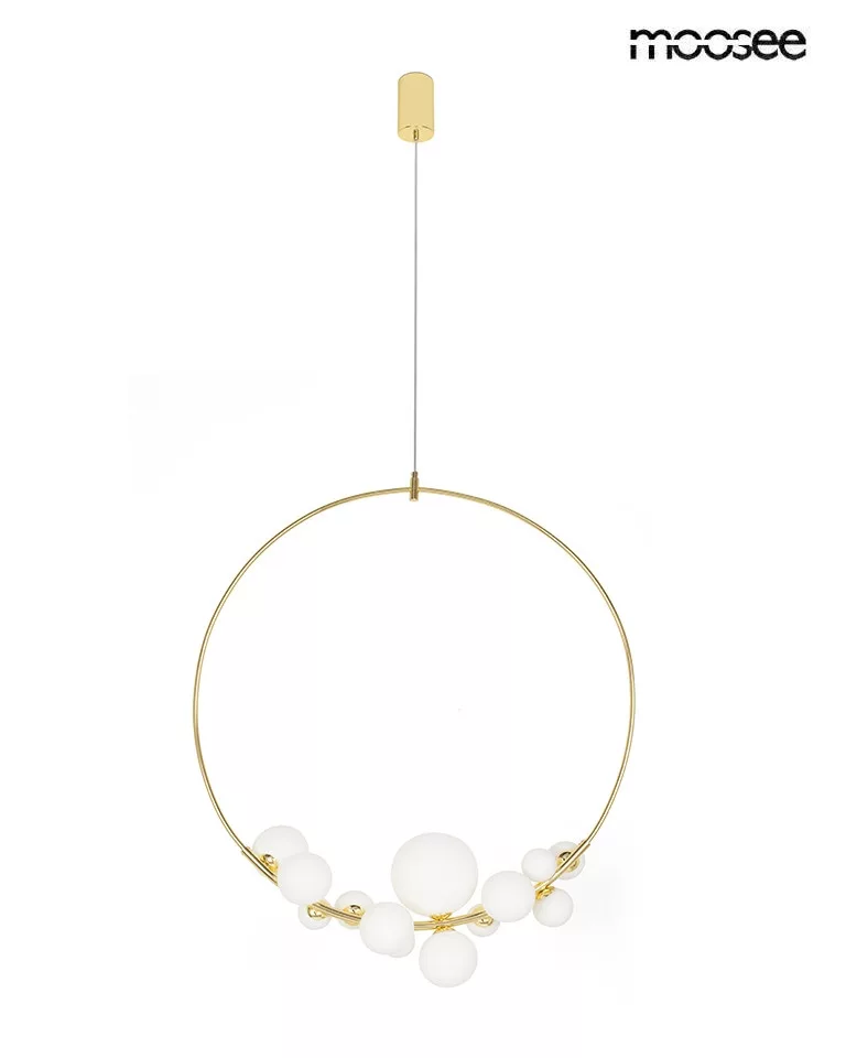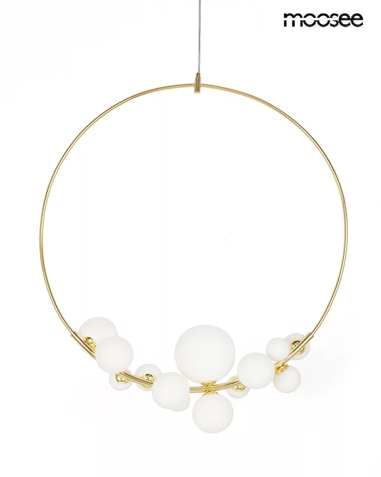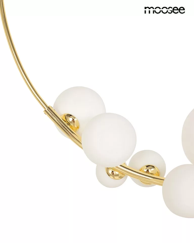 A MOOSEE Rocio függőlámpa az elegancia és a modern design tökéletes ötvözete. Az arany színű, kecses fémkarika és a rajta elhelyezett matt fehér üveggömbök játékos kompozíciója egyedi látványt nyújt. A kézzel készített üveggömbök különböző méretekben harmonikusan illeszkednek a könnyed szerkezetbe.