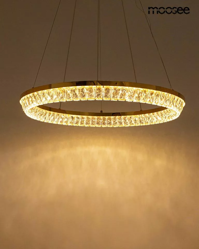 A 100 cm átmérőjű gyűrű formájú lámpatest 72W-os LED fényforrása kellemes, meleg fehér fényt biztosít, míg a kristályok látványos fényjátékot vetítenek a környezetre. A 180 cm-es állítható függesztékek lehetővé teszik a tökéletes magasság beállítását.