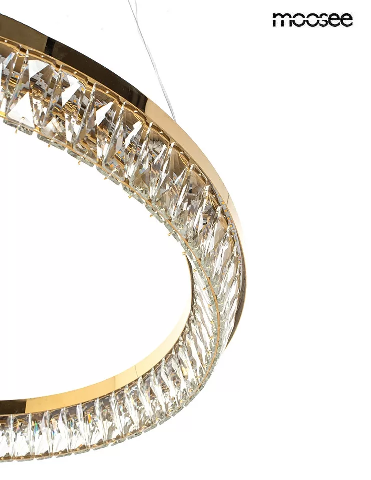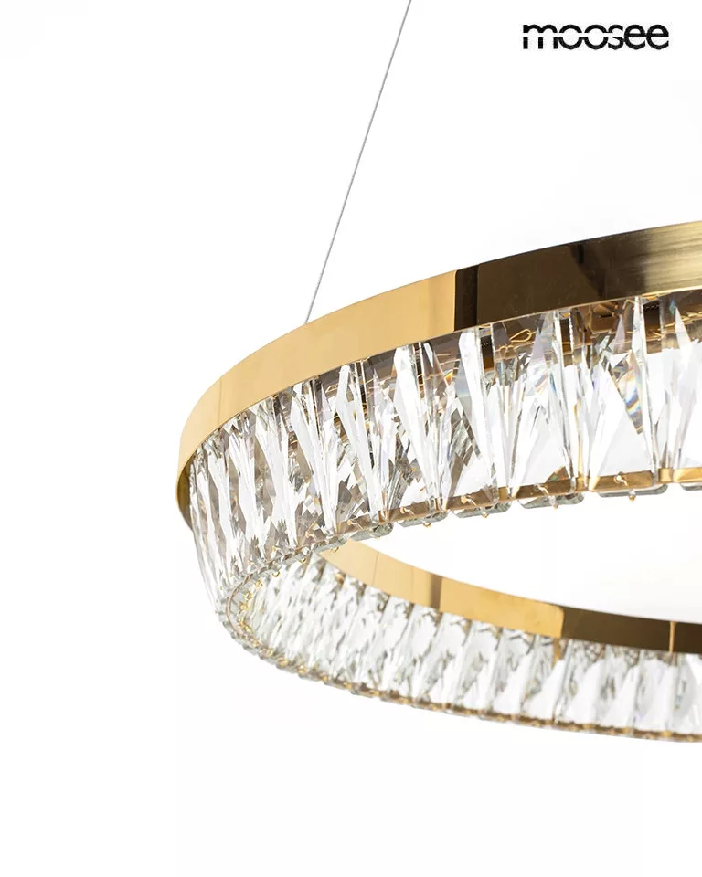 A MOOSEE Savoy kollekció zászlóshajója ez a lenyűgöző függőlámpa, amely ötvözi a modern LED technológiát a klasszikus kristály elemekkel. Az arany színű fém keret és a precízen megmunkált kristályok tökéletes harmóniában egyesülnek, létrehozva egy olyan világítótestet, amely nem csupán megvilágítja, de díszíti is a teret.