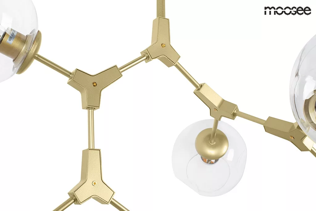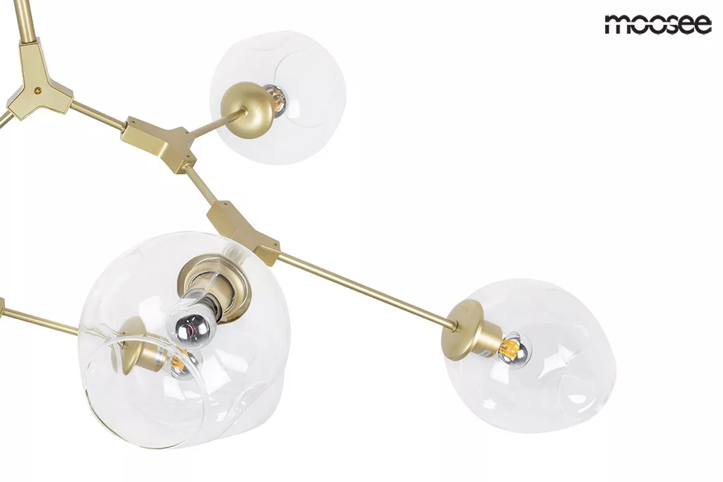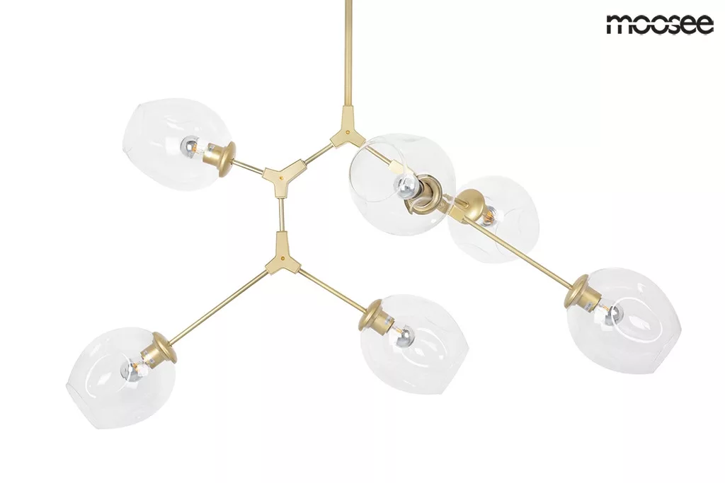 A MOOSEE Split 6 függőlámpa egy lenyűgöző világítási megoldás, amely a természet organikus szépségét ötvözi a modern dizájnnal. A fa ágak szerkezetét idéző arany fém váz hat átlátszó üveg burát tart, amelyek látszólag véletlenszerűen, mégis harmonikusan helyezkednek el a térben. Ez a gondosan megtervezett aszimmetria egyedi vizuális élményt nyújt minden nézőpontból.