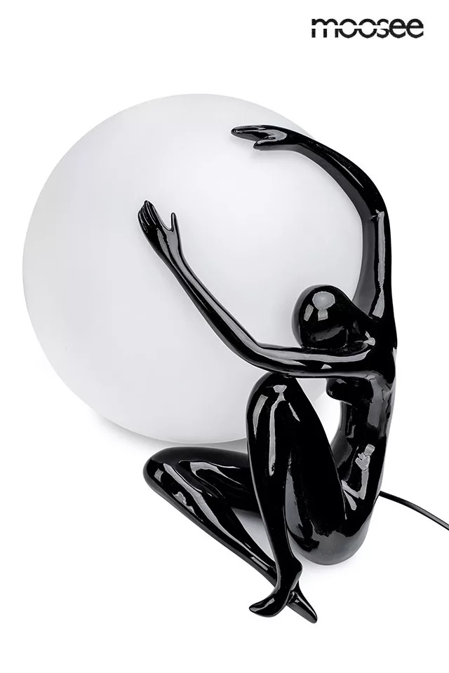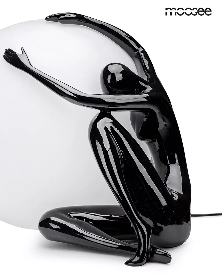 Elegáns művészi asztali lámpa, amely ötvözi a funkcionális világítást és a dekoratív dizájnt. A fekete műgyanta figura és a fehér gömblámpa harmonikus egységet alkot.