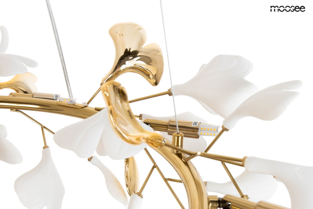 A MOOSEE Flora függőlámpa a természet és design tökéletes harmóniáját testesíti meg. A kifinomult arany vázszerkezet és a fehér kerámia virágszirmok játékos összhangja különleges fényjátékot teremt a térben. Az elegáns kialakítás a botanikai elemek és modern design ötvözésével egyedi hangulatot teremt.
