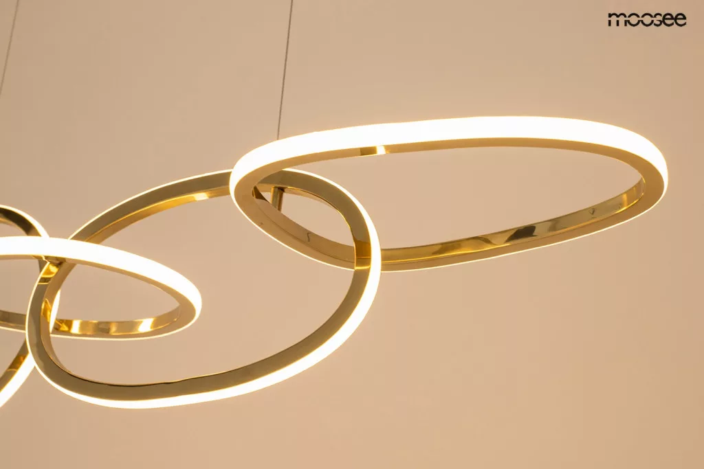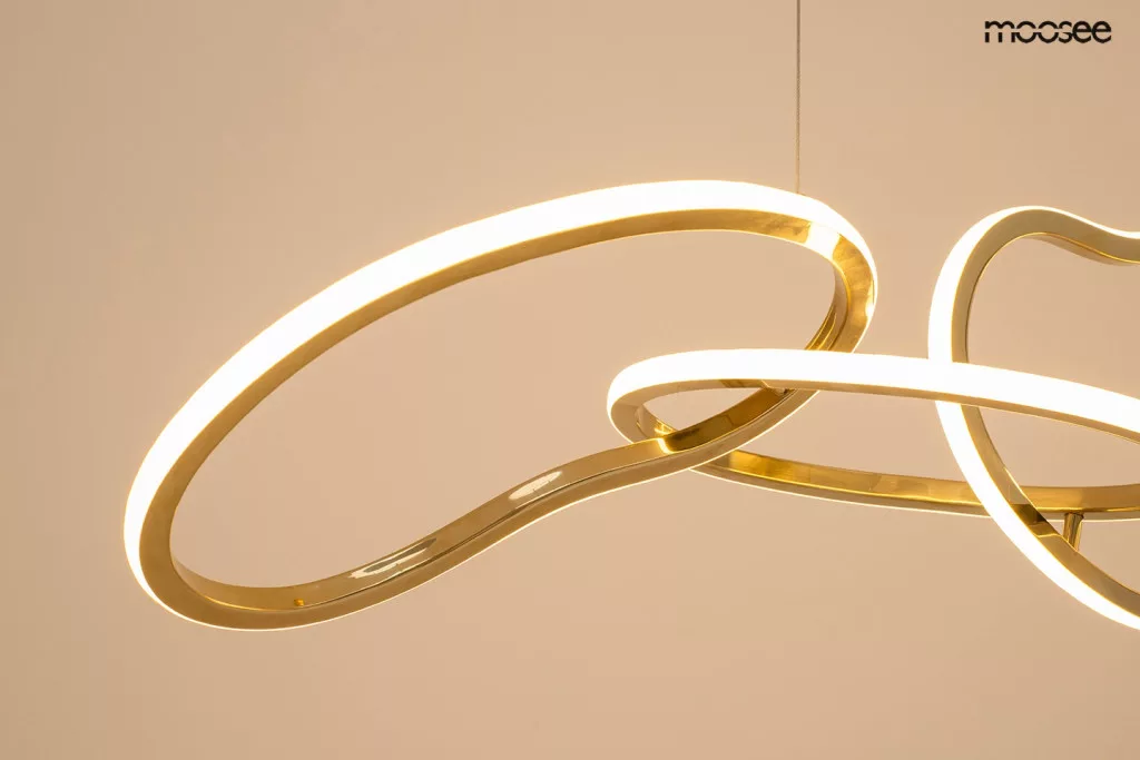 A MOOSEE JAZZ 5 függőlámpa a modern világítástechnika és az időtlen dizájn tökéletes ötvözete. Az öt, organikusan hajlított arany gyűrű egyedi táncot jár a térben, míg a külső LED világítás különleges fényjátékot teremt a környezetében. A lámpa nem csupán világítótest, hanem művészi installációként is szolgál.