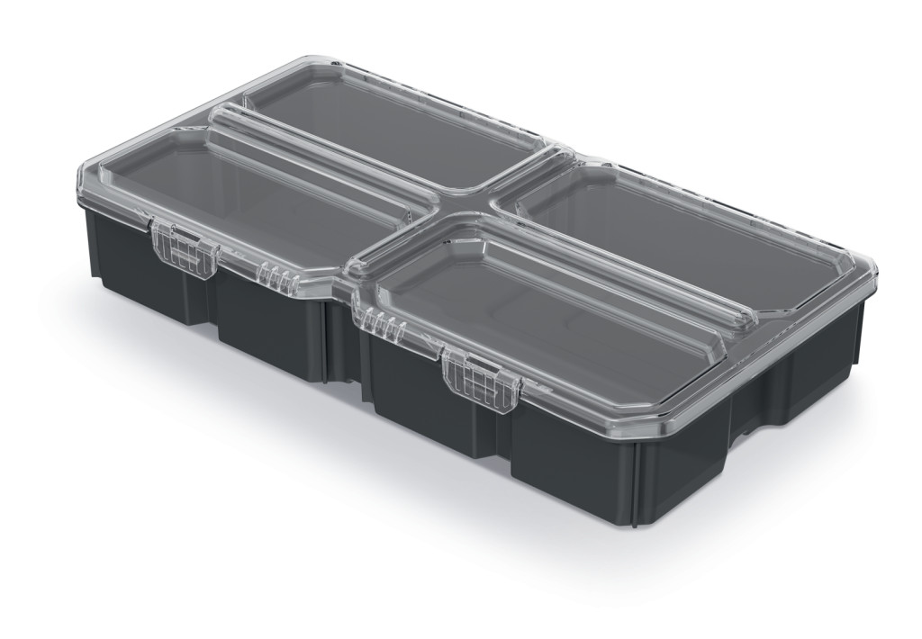 Professzionális szerszámrendező doboz kivehető elválasztókkal, átlátszó fedéllel és IP55 védettséggel a szerszámok biztonságos tárolásához.