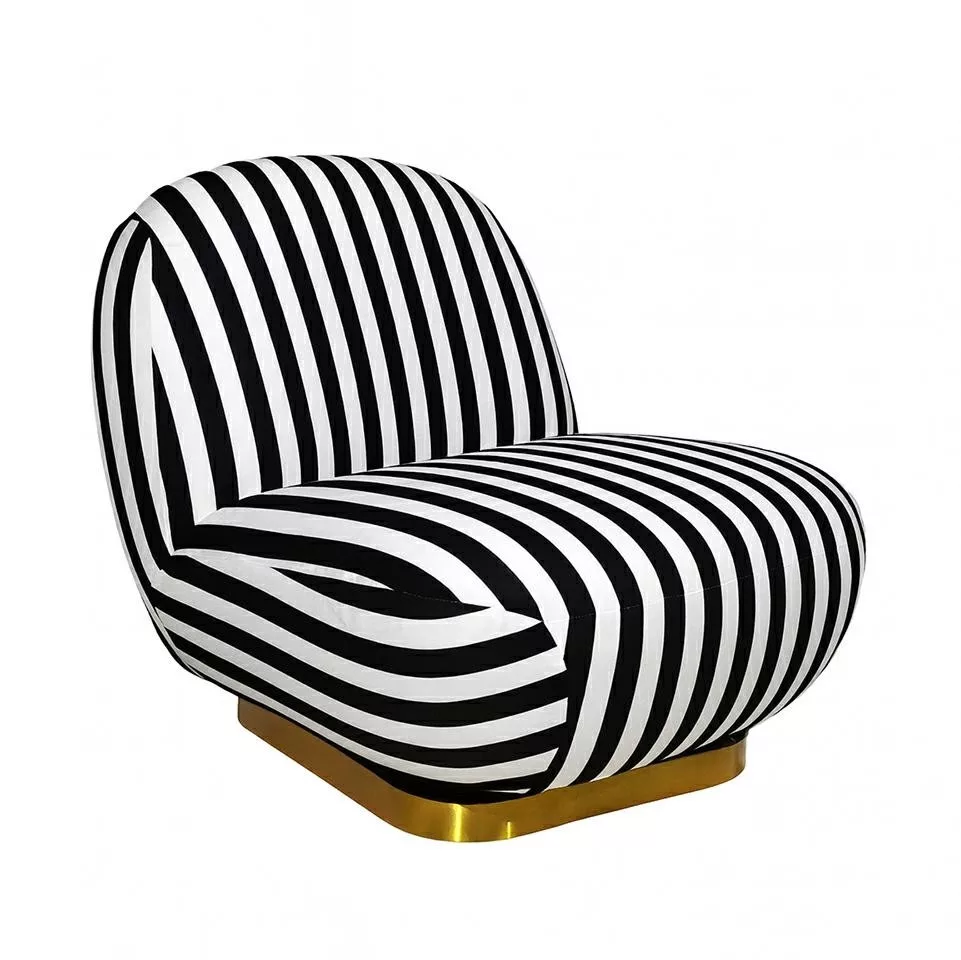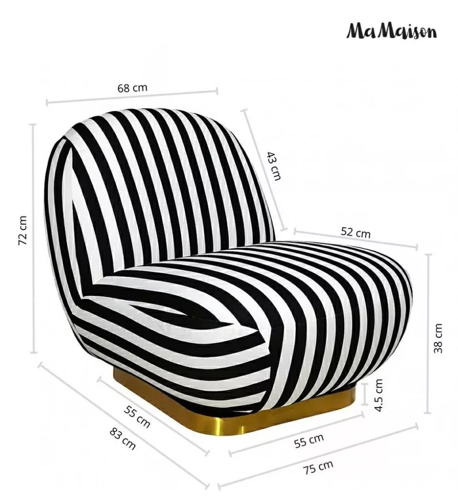 Az Azure forgó fotel a modern design és funkcionalitás találkozása. A fekete-fehér csíkos kárpitozás markáns megjelenést kölcsönöz, míg az arany színű acél talp luxus érzetet sugall. A lekerekített formák és az ergonomikus kialakítás maximális kényelmet biztosítanak.