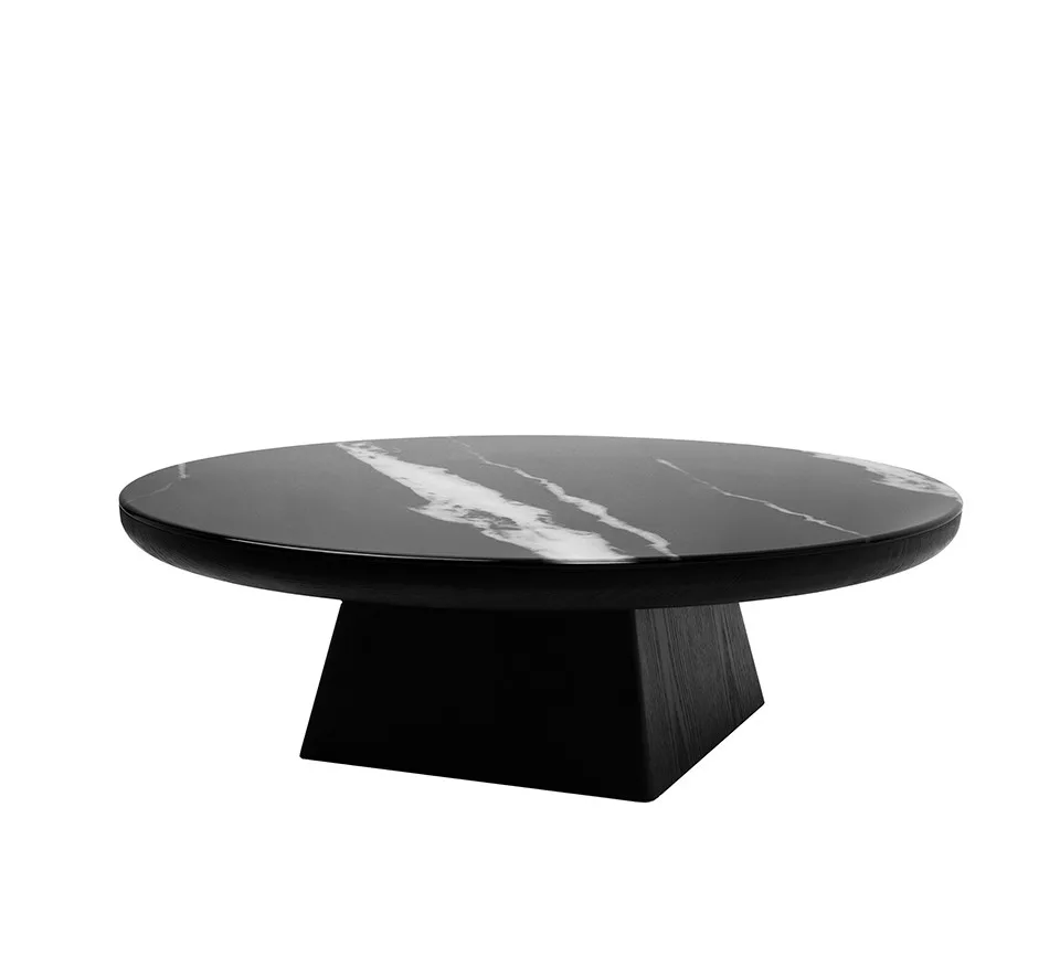 A masszív fa alap geometrikus, kúpos formája erőteljes kontrasztot teremt a sima asztallappal, miközben kiváló stabilitást biztosít. A 100 cm átmérőjű asztal ideális méretű kávézáshoz, könyvek elhelyezéséhez vagy dekoratív tárgyak bemutatásához. Az alacsony, 30 cm-es magasság modern, laza ülőgarnitúrákhoz illeszkedik tökéletesen. Legyen szó kortárs, minimalista vagy loft stílusú berendezésről, ez a dohányzóasztal minden esetben a tér központi eleme lesz.