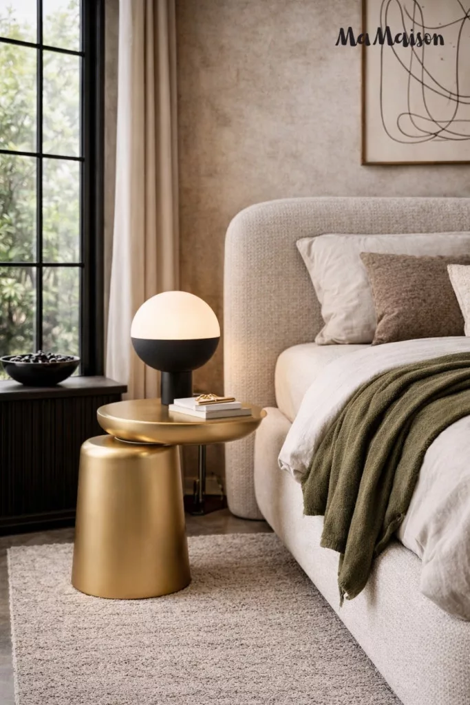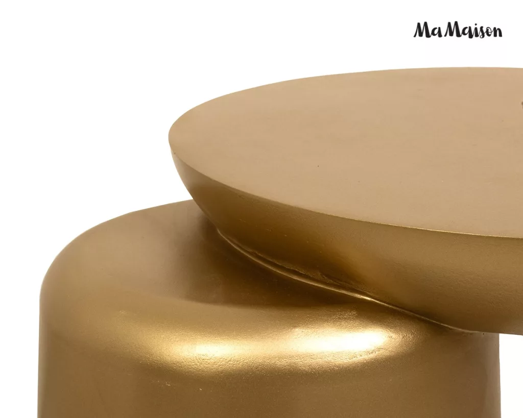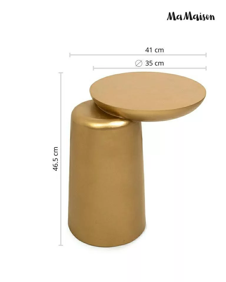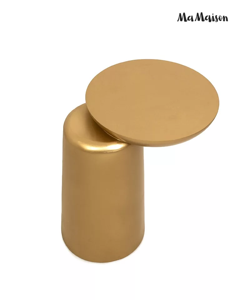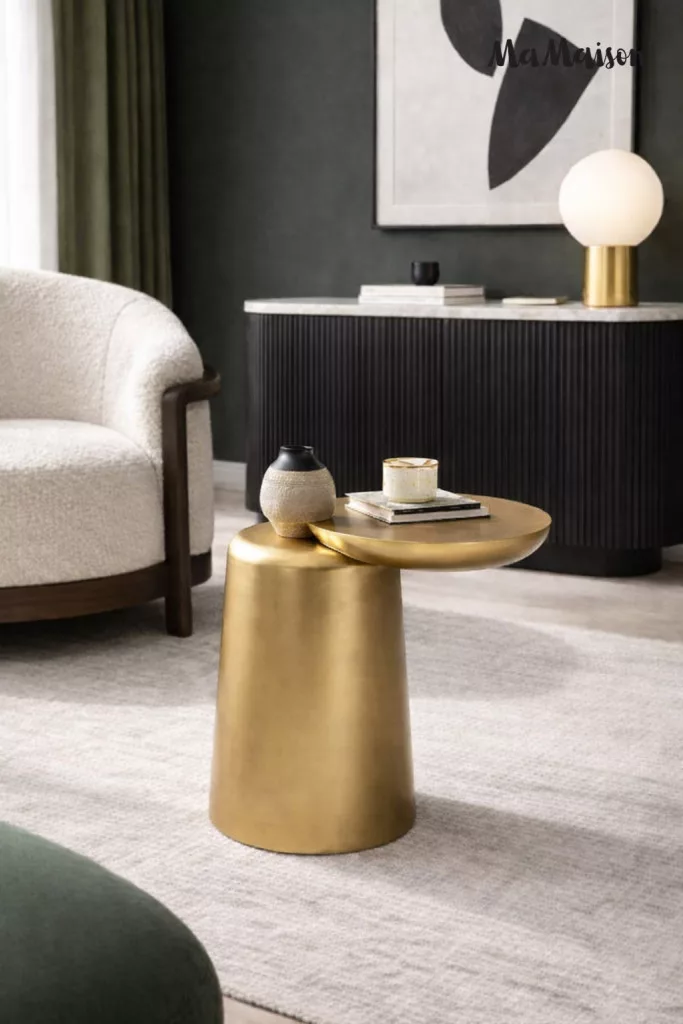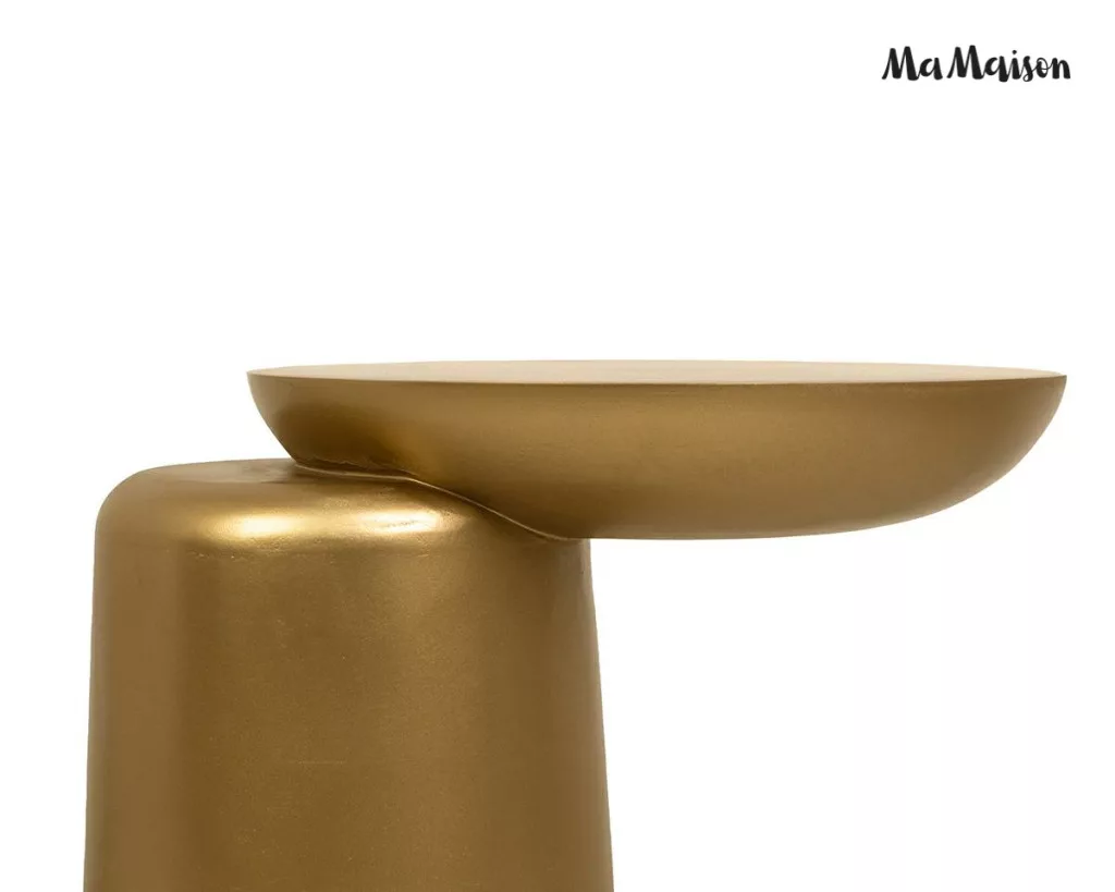 A kisasztal tökéletes egyensúlyt teremt a természetes és a fémes elemek között, miközben funkcionális kiegészítőként szolgál bármely helyiségben. Különleges formája és arany színe azonnal a figyelem középpontjába helyezi ezt az exkluzív bútordarabot.