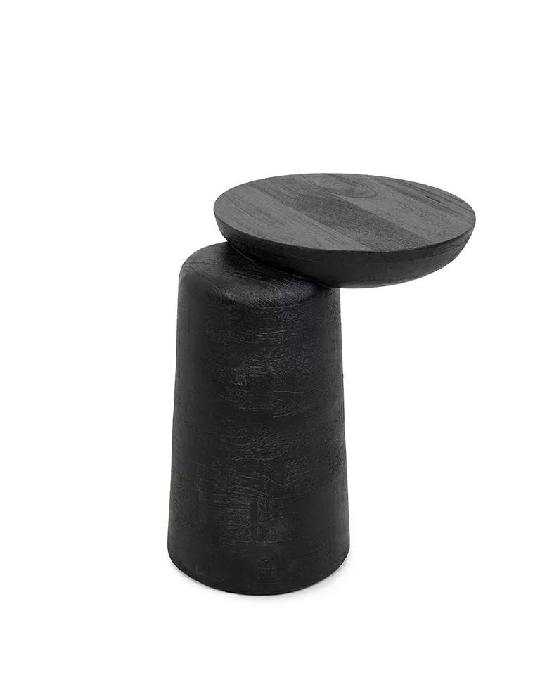 Modern, aszimmetrikus kialakítású kisasztal természetes mangófából, matt fekete kivitelben. Egyedi dizájnja és kompakt mérete tökéletes kiegészítővé teszi bármely élettérben.