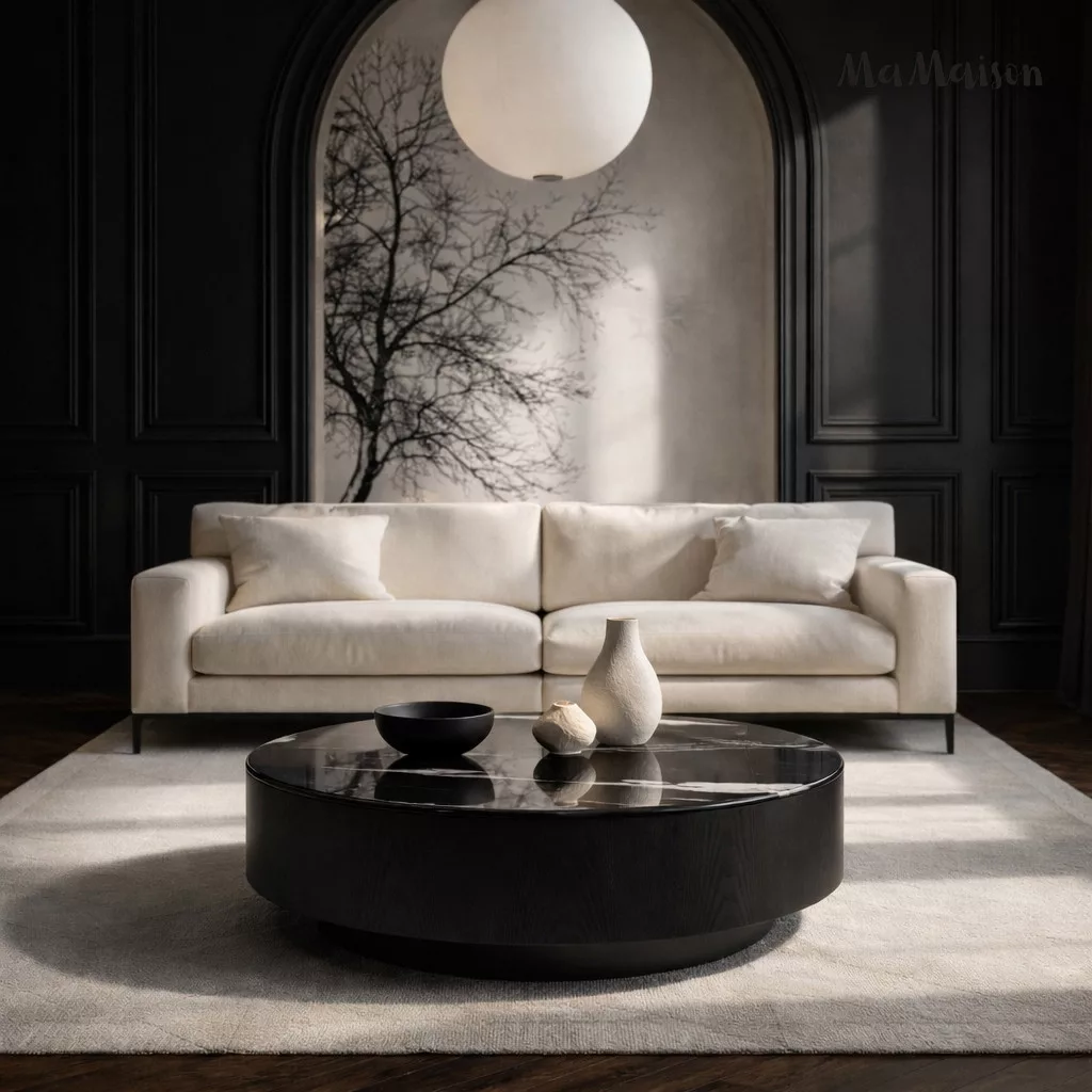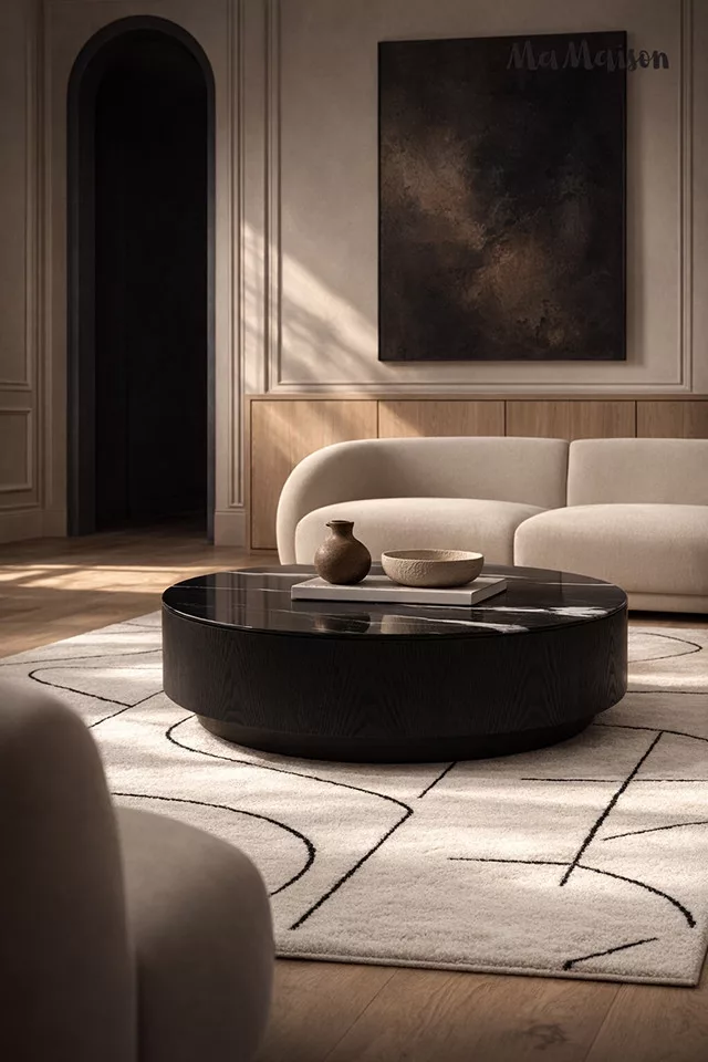 A MaMaison LAGO 100 dohányzóasztal lenyűgöző középpontja lehet nappalijának. A 100 cm átmérőjű kerek lap gyantából készült, amelyet elegáns, márványszerű mintázat díszít fehér erezettel a fekete alapon. A finom fényű felület gyönyörűen tükrözi a fényt, vizuális mélységet és luxust kölcsönözve a térnek. Az alacsony, 30 cm-es magasság tökéletes arányokat teremt, miközben a masszív fa alap stabilitást és természetes melegséget biztosít.