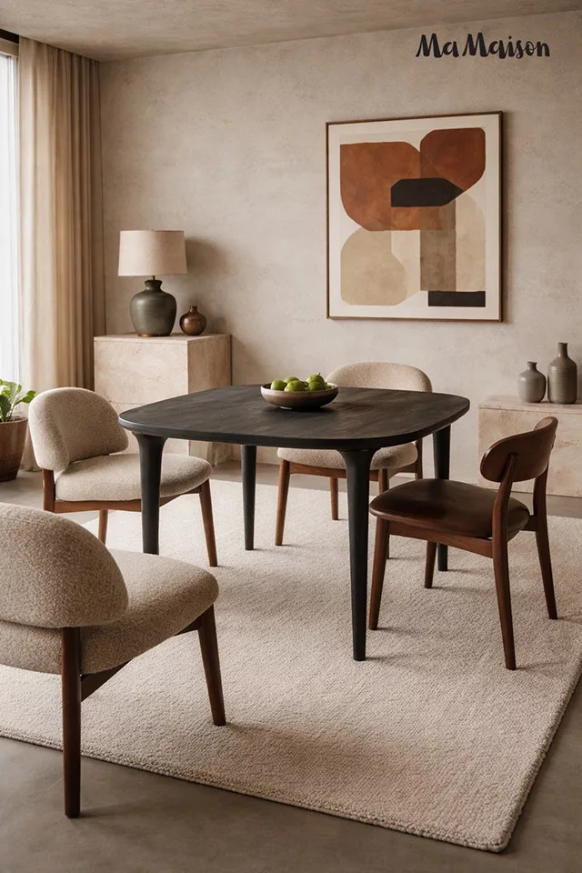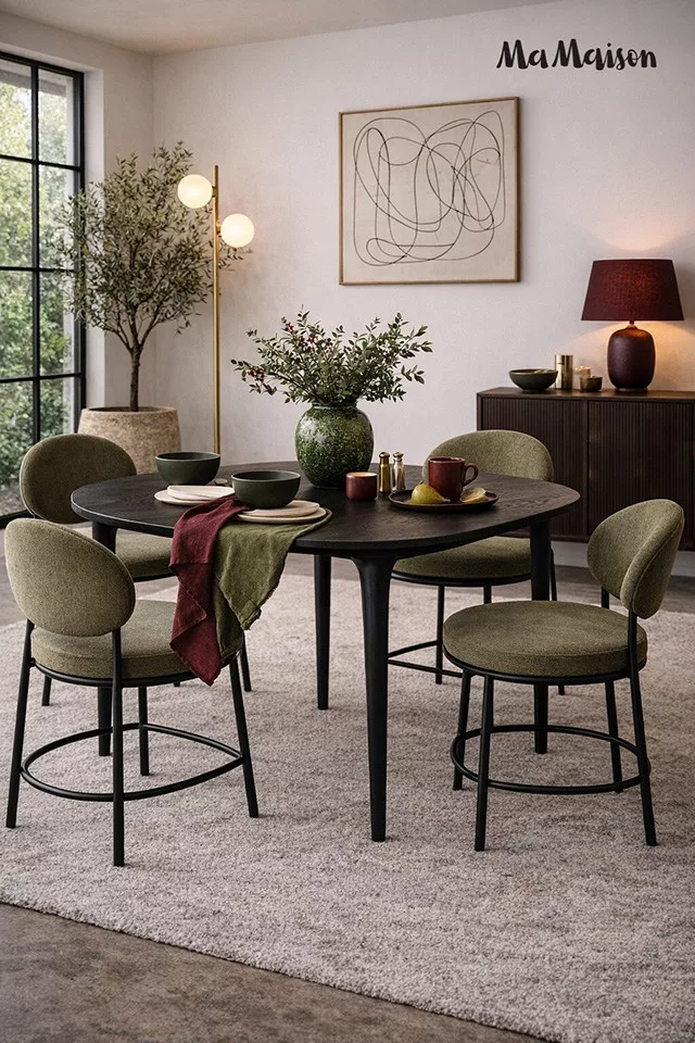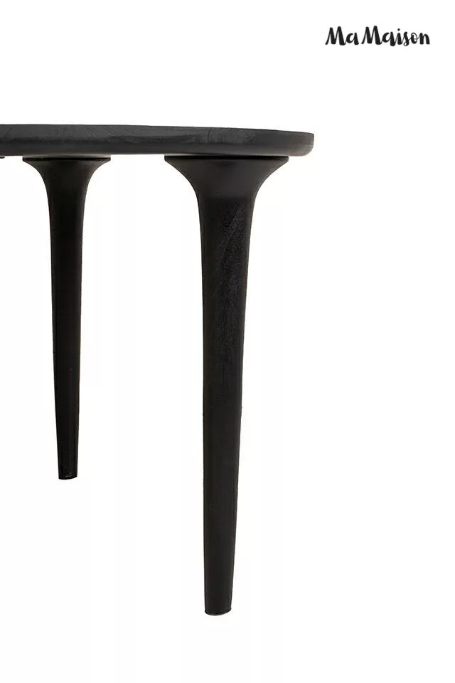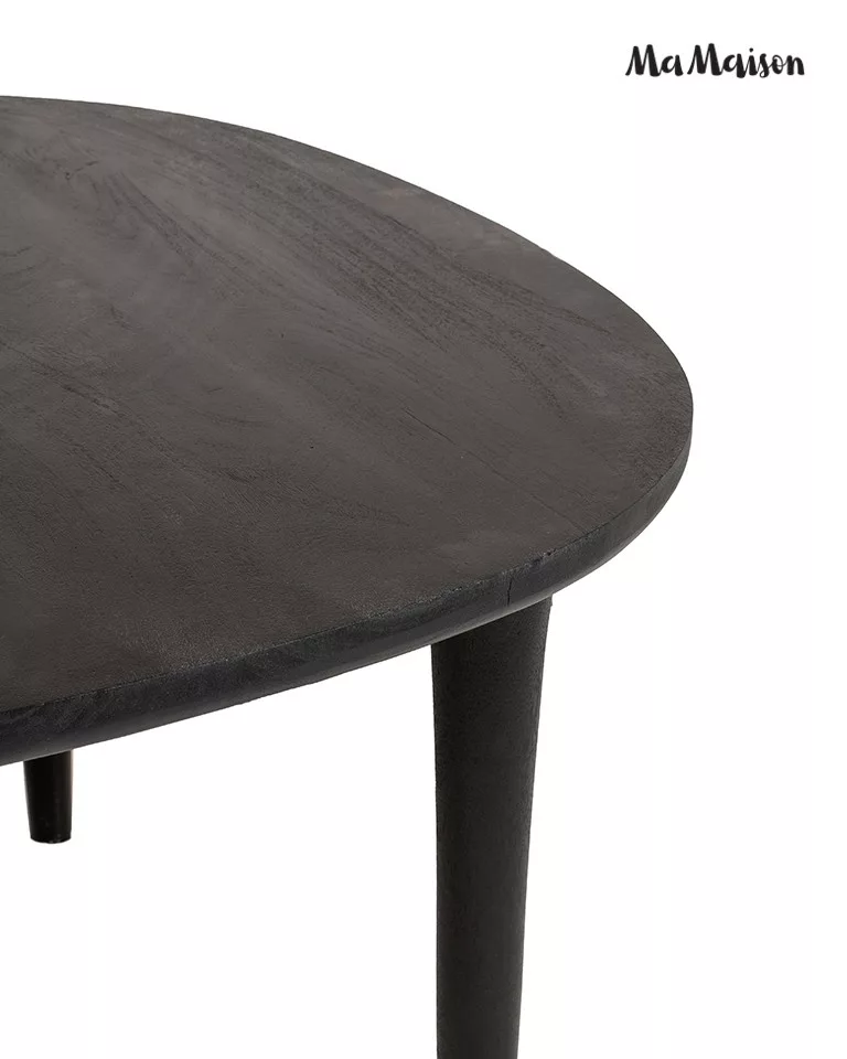 Elegáns, minimalista étkezőasztal tömör mangófából, fekete kivitelben. A kerek asztallap és karcsú lábak tökéletes harmóniát teremtenek a modern otthonokban.