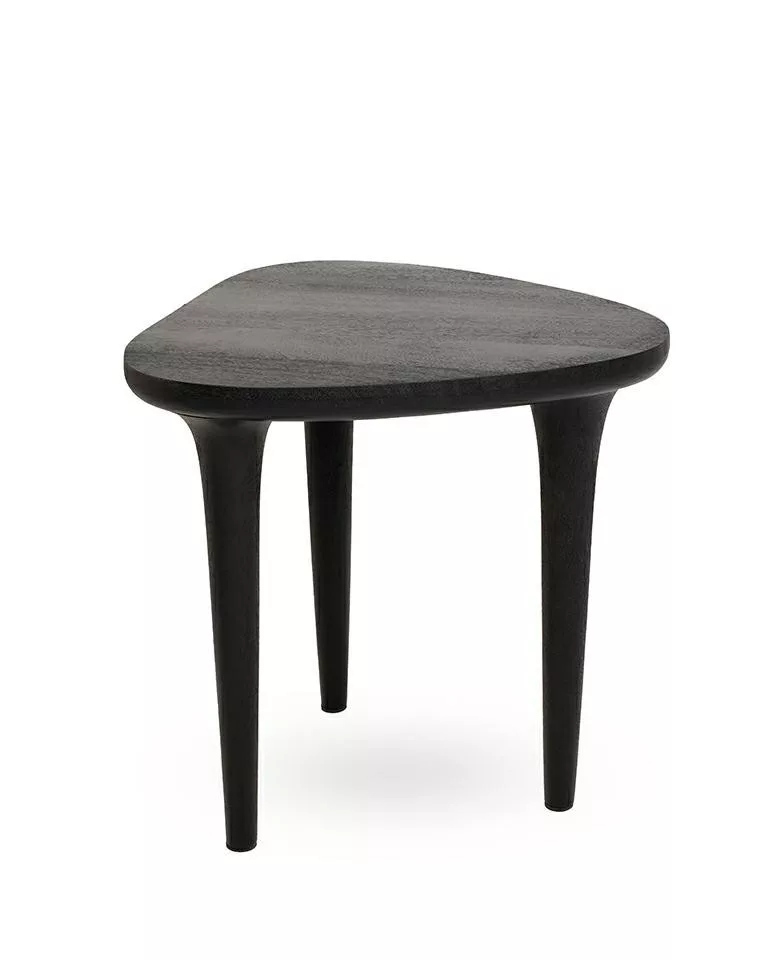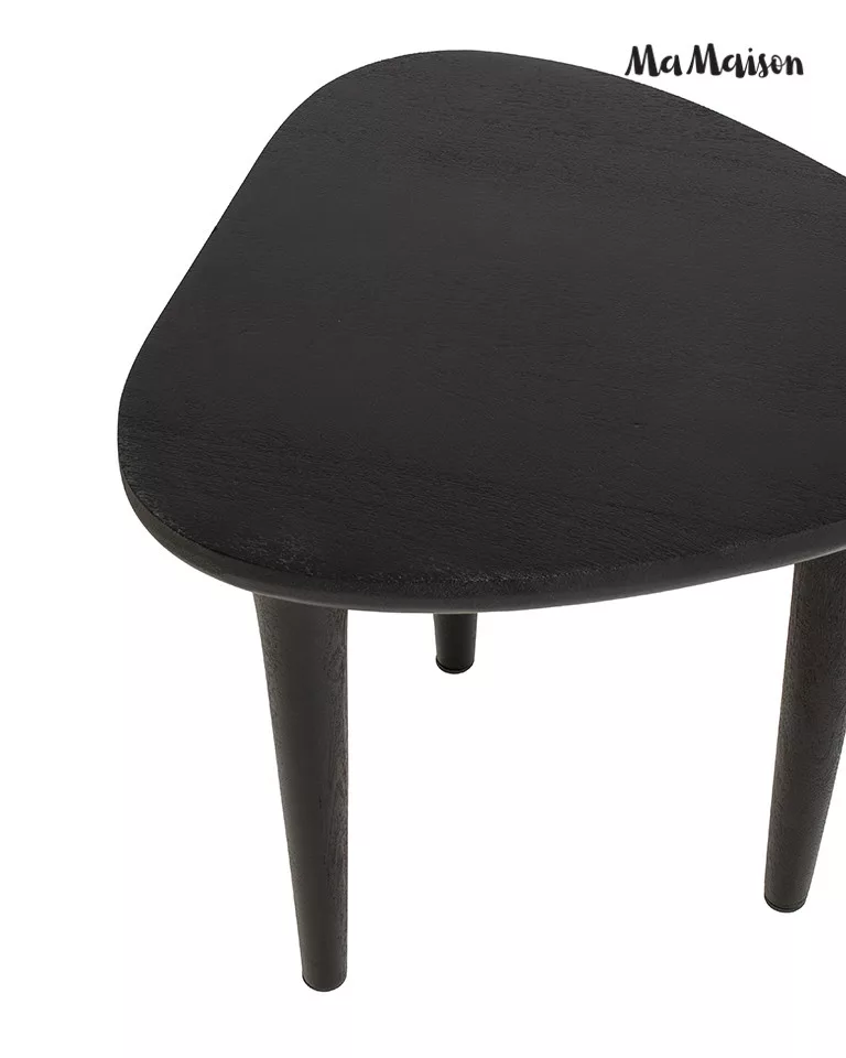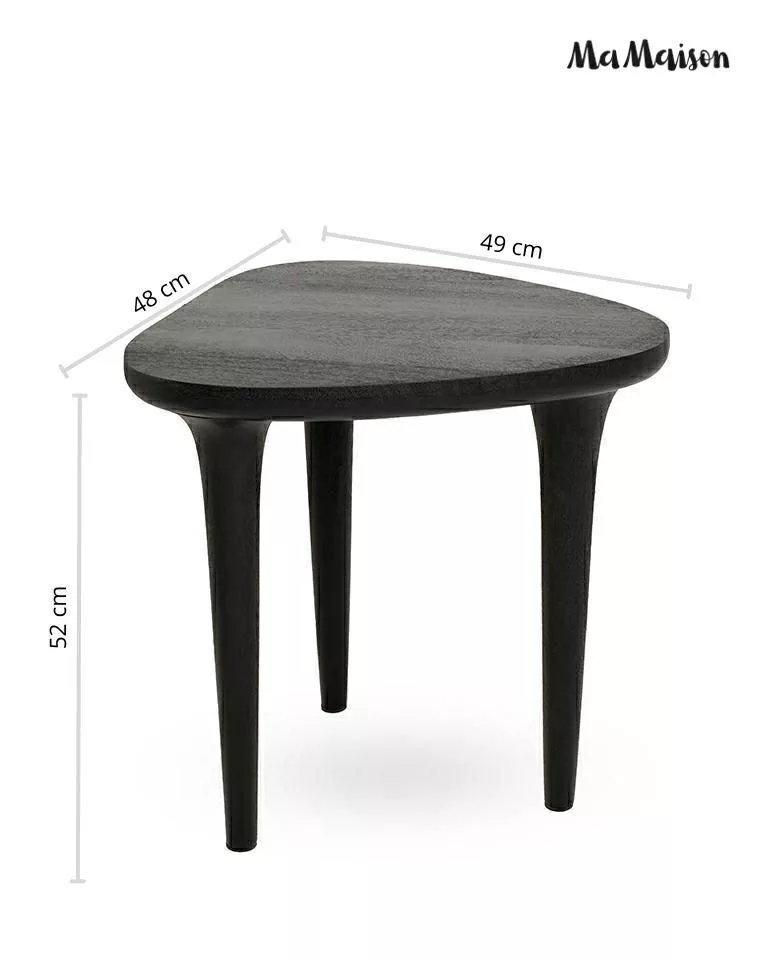 Elegáns, háromszög alakú dohányzóasztal természetes mangófából, modern fekete kivitelben. Egyedi formája és időtlen dizájnja tökéletes kiegészítője a kortárs lakberendezésnek.