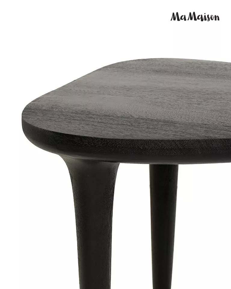 Az asztal stabil, három karcsú lába és kompakt mérete ideálissá teszi kisebb terekbe is. A természetes mangófa felület minden darabot egyedivé tesz, míg a fekete szín elegáns megjelenést biztosít, amely könnyen illeszkedik bármilyen lakberendezési stílushoz.