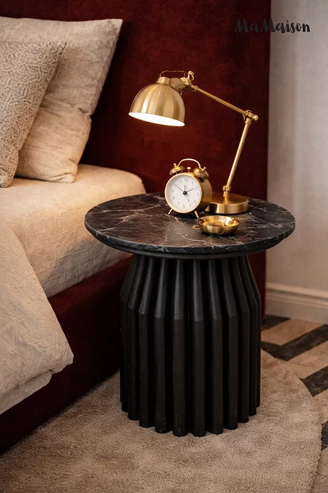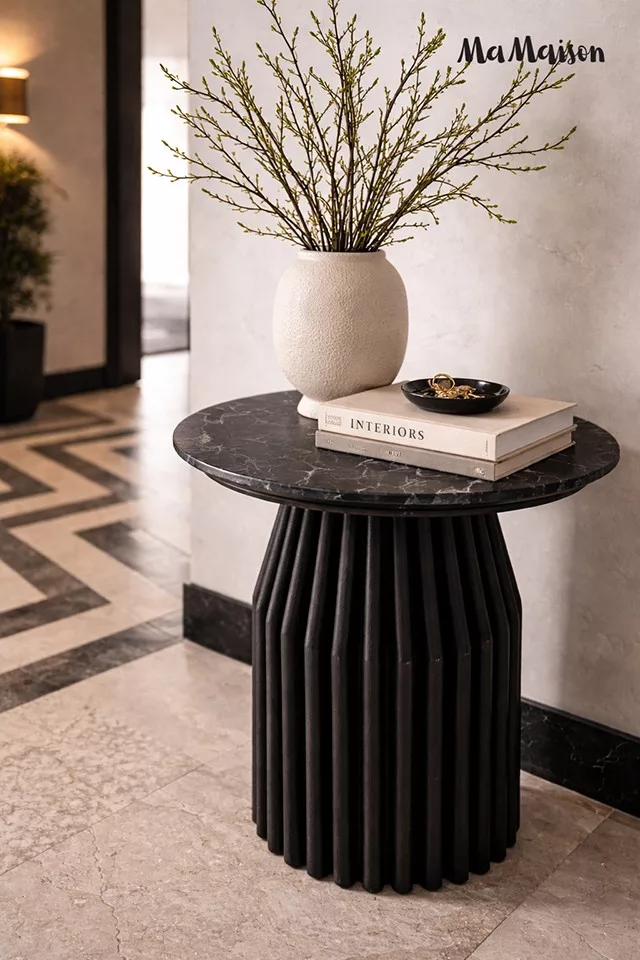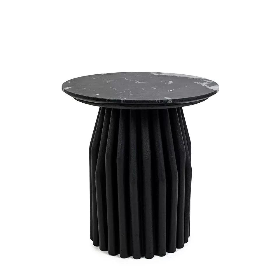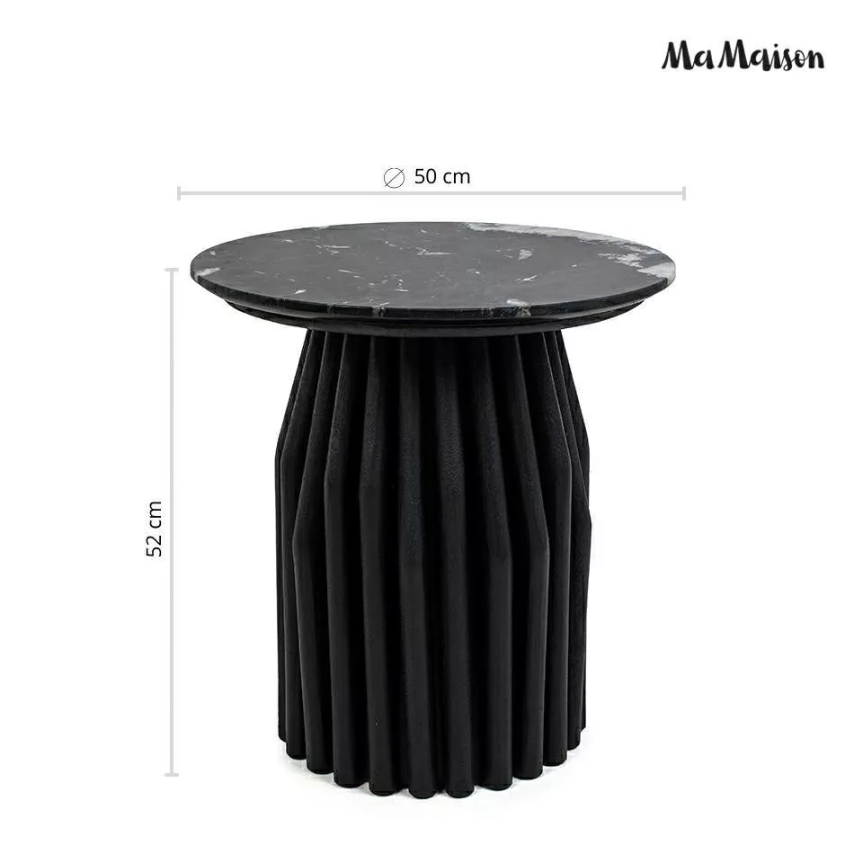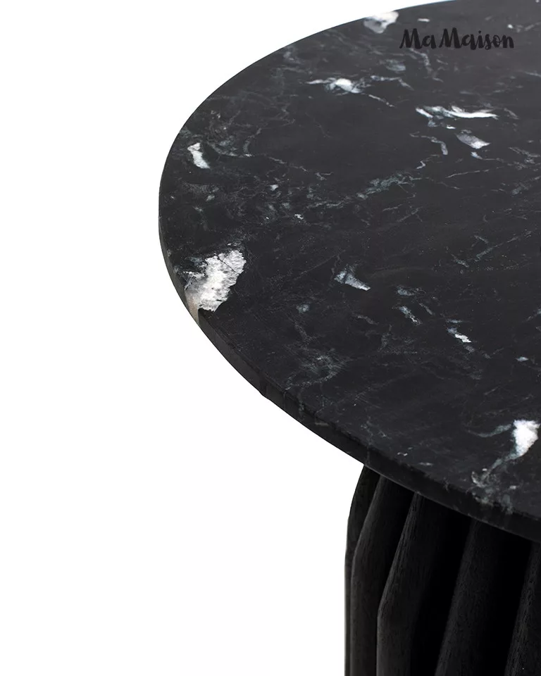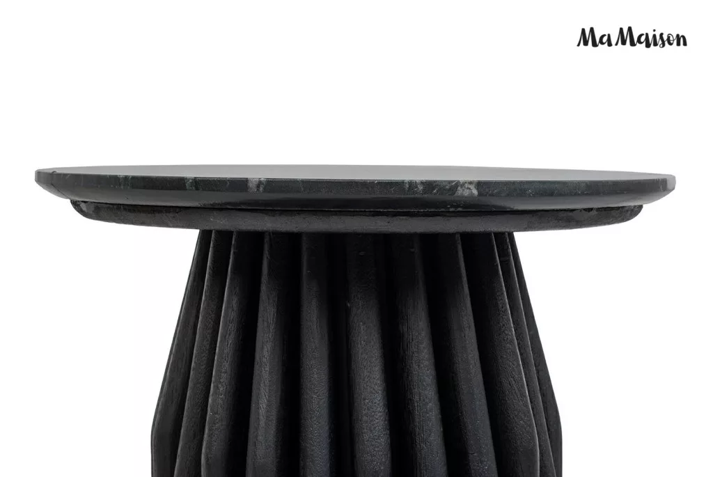 Elegáns dohányzóasztal fekete márvány lappal és egyedi, bordázott mangófa lábszerkezettel, amely tökéletesen ötvözi a modern dizájnt a természetes anyagokkal.