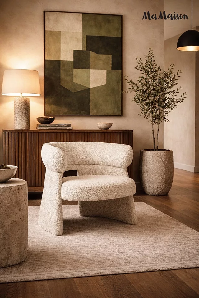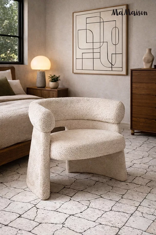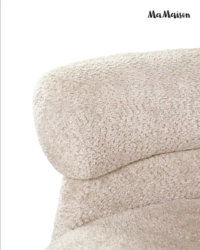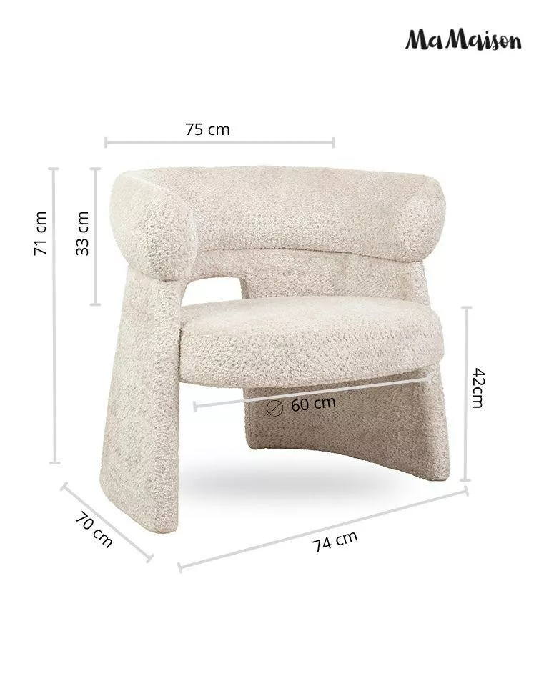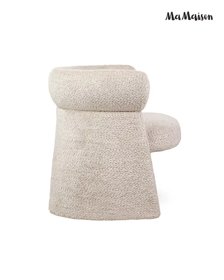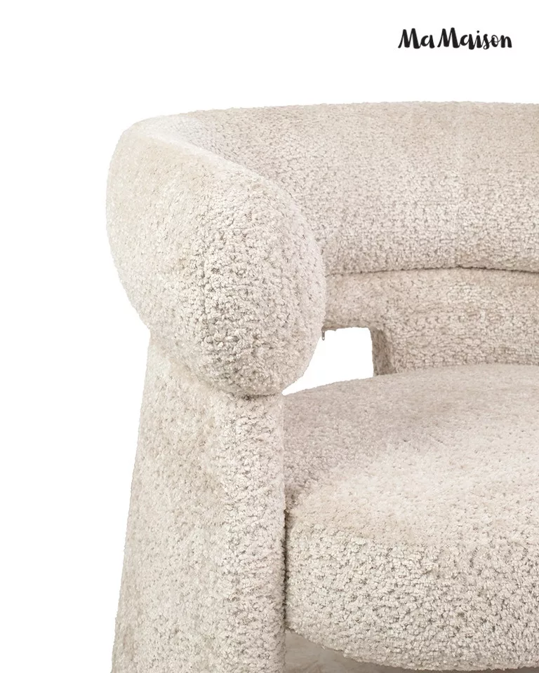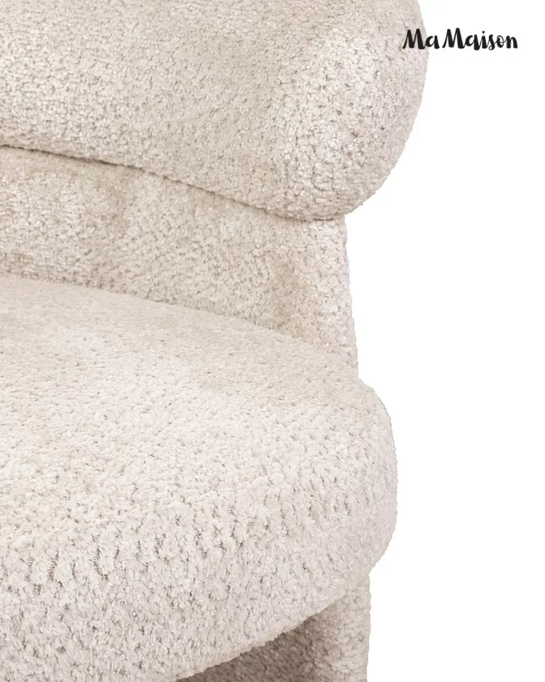 A MaMaison Madame fotel egyedi formatervezésével és kiváló minőségű senilia szövet kárpitozásával a modern lakberendezés kiemelkedő darabja. A lágy, bézs árnyalat és az innovatív forma tökéletes harmóniát teremt, míg a széles, kényelmes ülőfelület és az ergonomikus kialakítás maximális komfortérzetet biztosít.