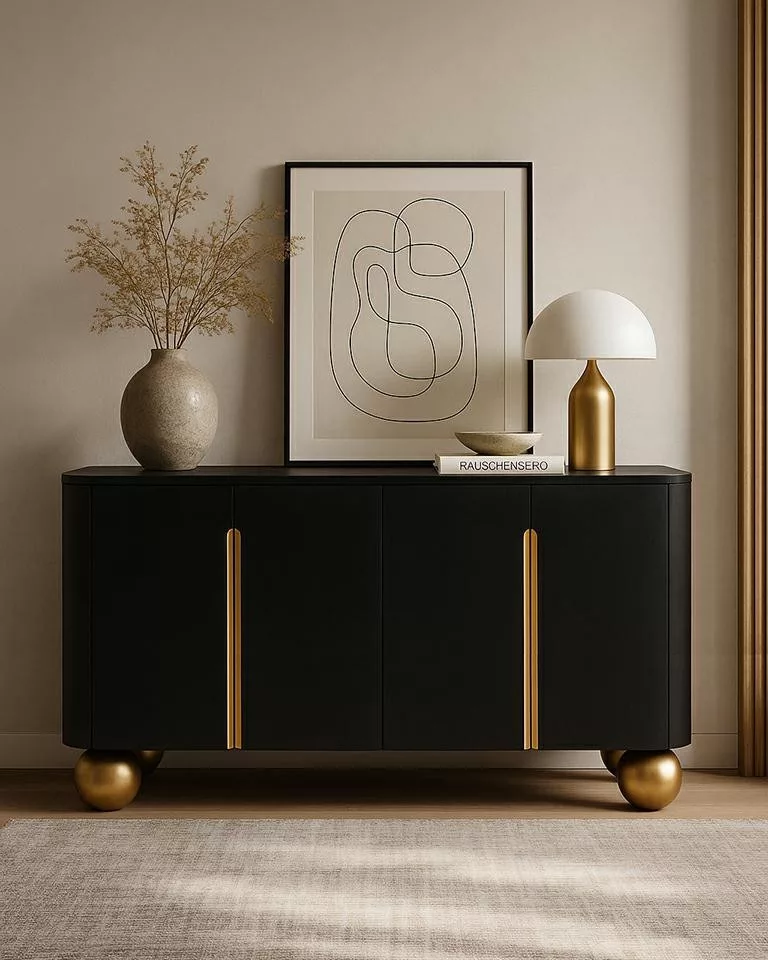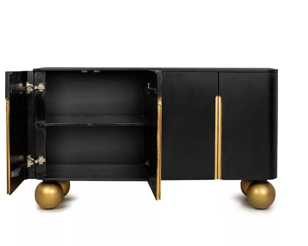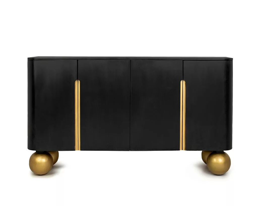 Elegáns, modern komód mangófából, fekete-arany színkombinációval és egyedi gömblábakkal, amely tökéletes ötvözete a funkcionalitásnak és a luxus designnak.