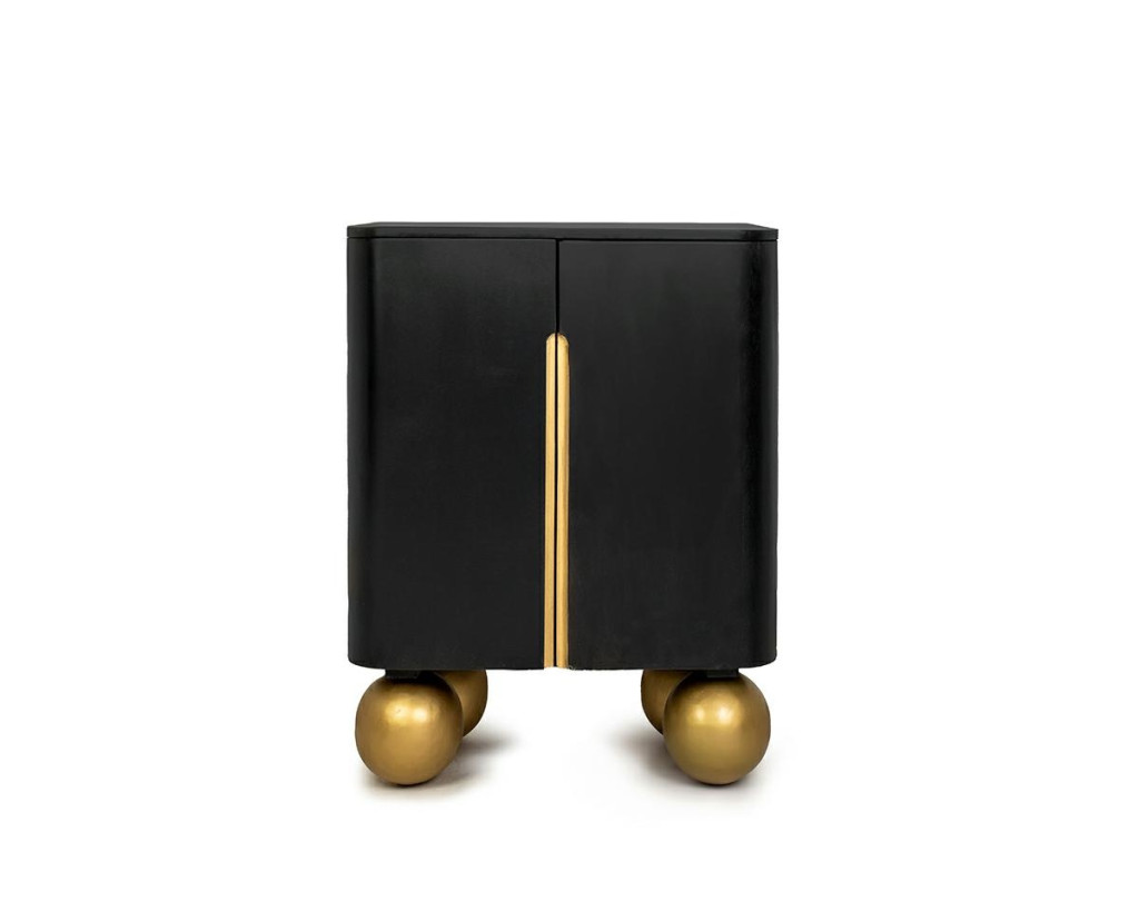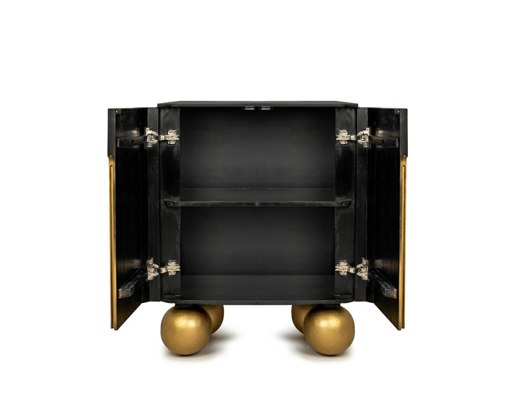 Elegáns, modern komód mangófából, fekete-arany színkombinációval és egyedi gömblábakkal, amely tökéletes ötvözete a funkcionalitásnak és a luxus dizájnnak.