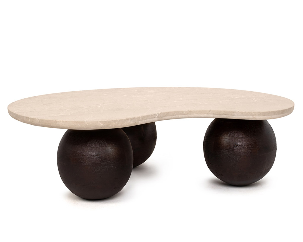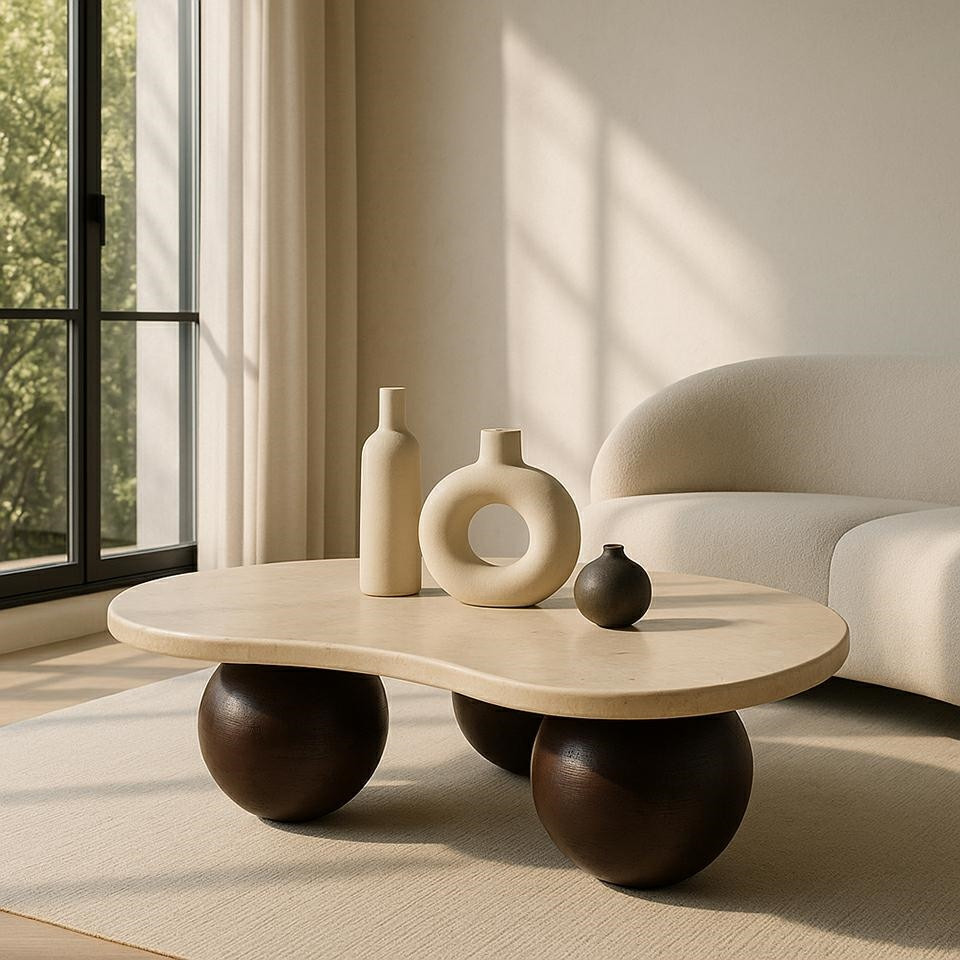Egyedi tervezésű dohányzóasztal organikus formával, travertin kőlappal és gömb alakú mangófa lábakkal, mely tökéletes összhangot teremt a modern és természetes stílusok között.
