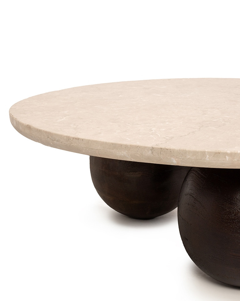 A MaMaison Organic dohányzóasztal a kifinomult design és a természetes anyagok tökéletes harmóniáját testesíti meg. A bézs színű travertin kőlap organikus formája lágy, természetes megjelenést kölcsönöz, míg a három gömb alakú, sötétbarna mangófa láb markáns kontrasztot képez.