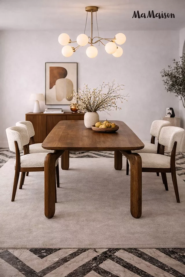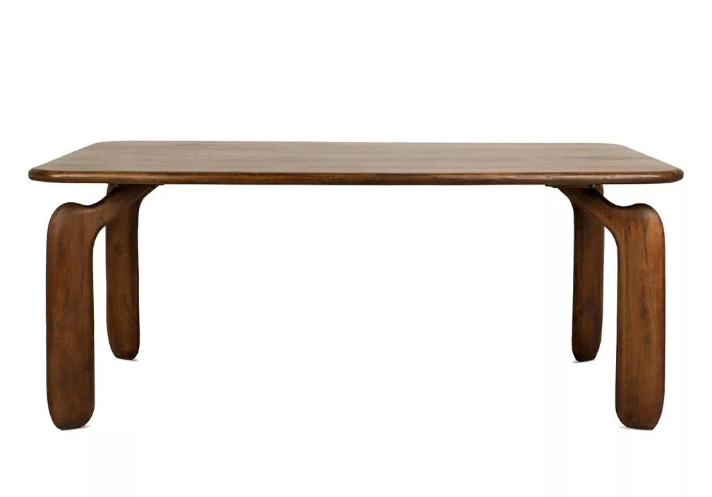 Elegáns, természetes mangófából készült étkezőasztal modern dizájnnal és lekerekített élekkel, amely tökéletesen ötvözi a funkcionalitást és az esztétikát.