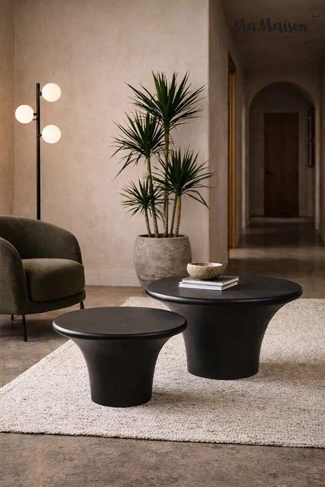 Elegáns, kétrészes dohányzóasztal szett organikus formákkal és matt fekete felülettel, amely tökéletesen ötvözi a modern dizájnt a funkcionalitással.