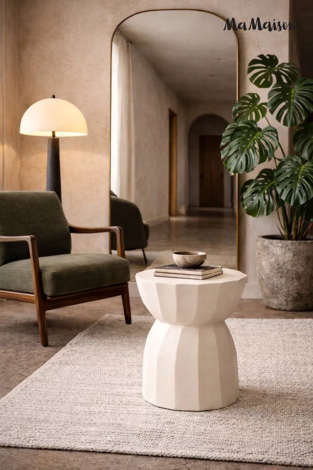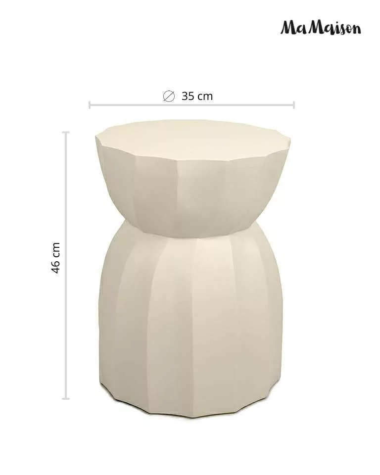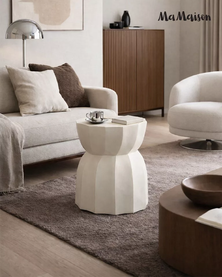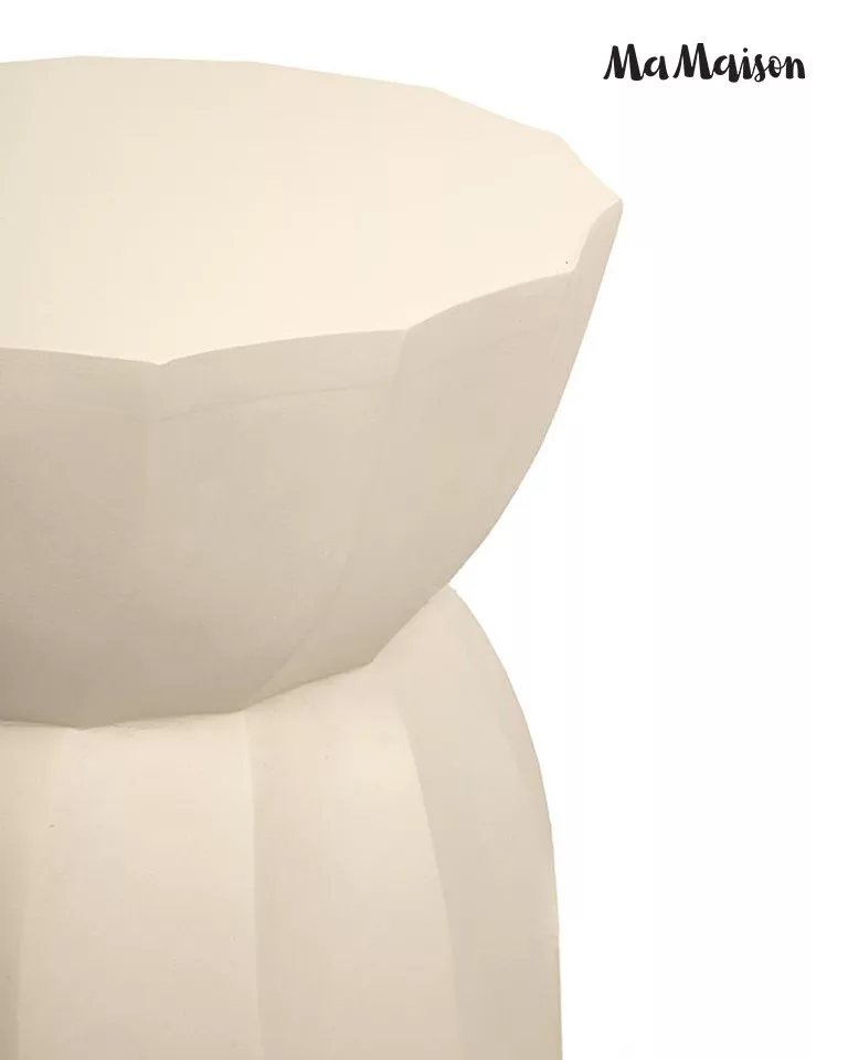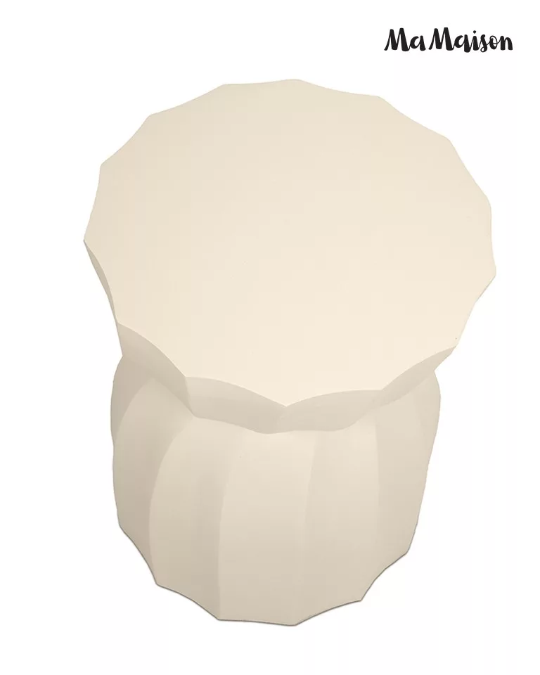 A MaMaison Rolling kisasztal egyedi, geometrikus formájával és bézs színével a modern lakberendezés különleges darabja. A mangófából készült asztal természetes szépsége és a precíz kidolgozású, sokszögletű forma tökéletes harmóniát alkot, miközben minden darab egyedi erezete különlegessé teszi a bútort.