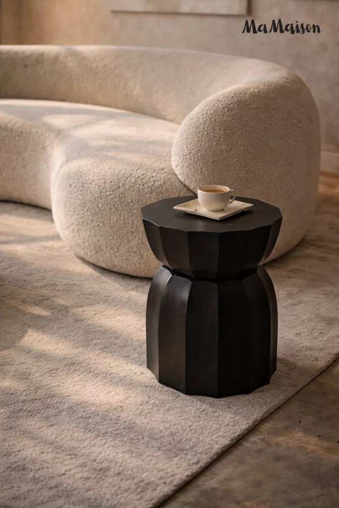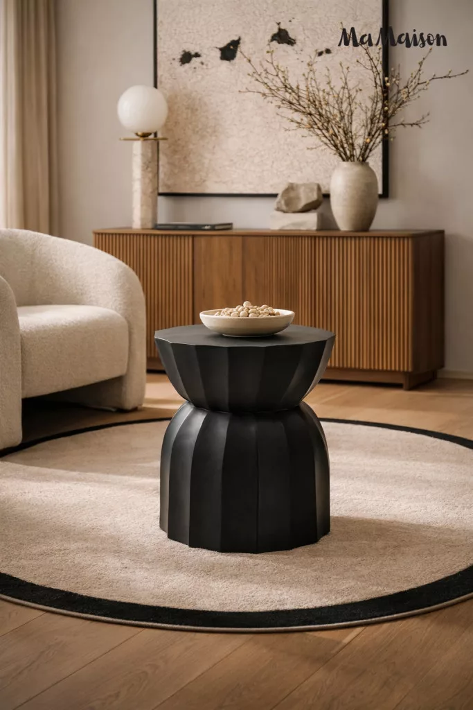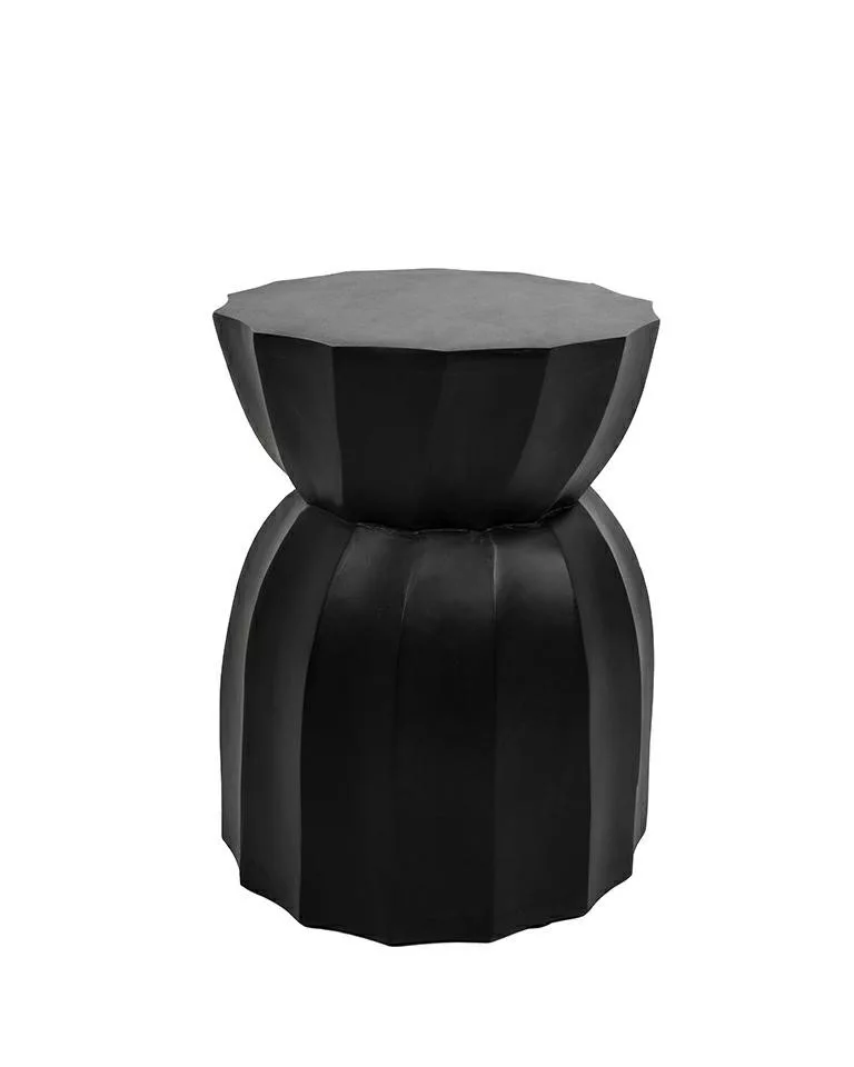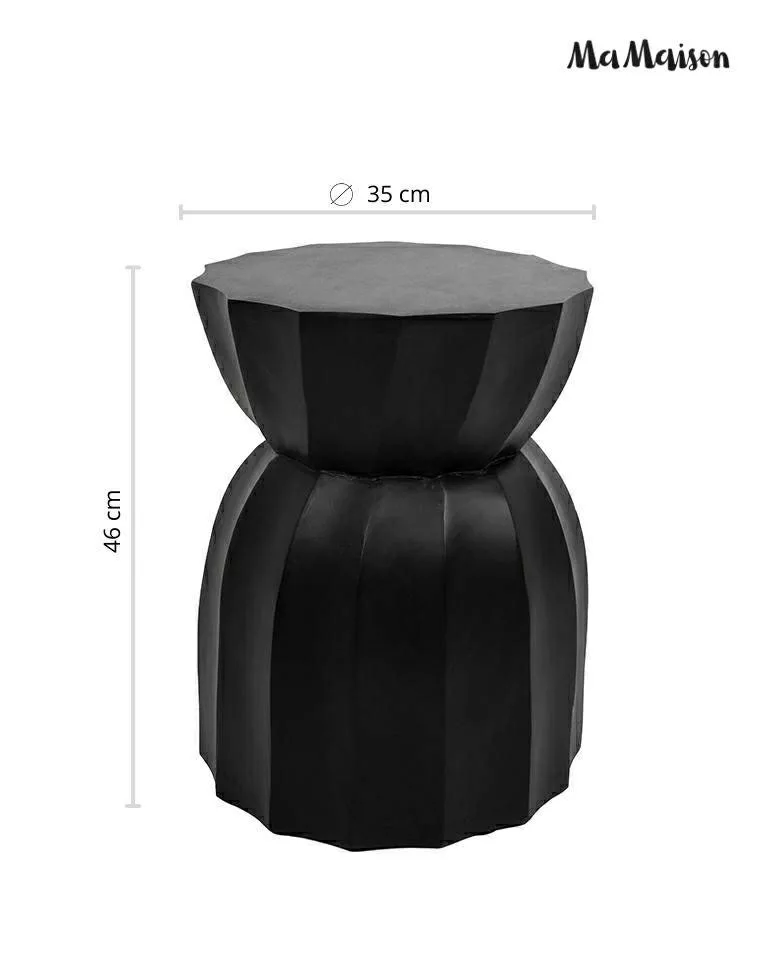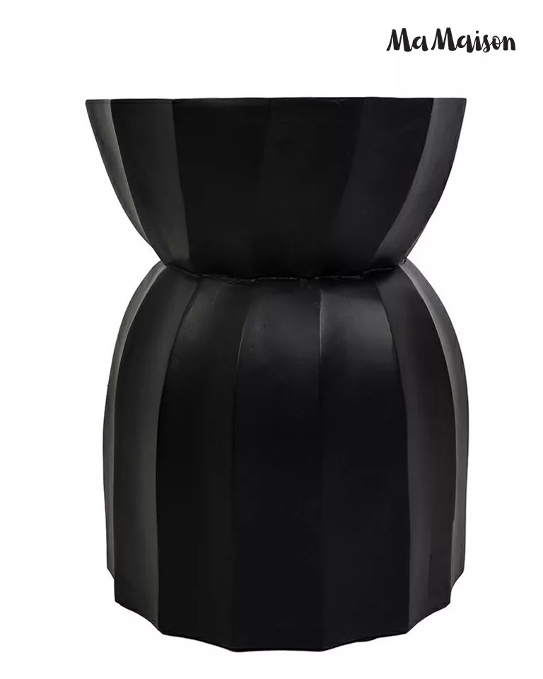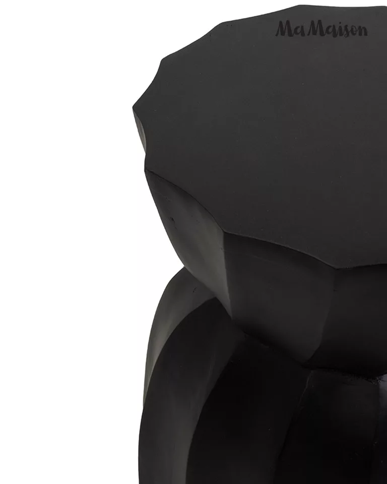 Modern geometrikus formájú kisasztal mangófából, elegáns fekete kivitelben. Egyedi barázdált kialakítása és időtlen dizájnja tökéletes kiegészítője a kortárs és klasszikus enteriőröknek.