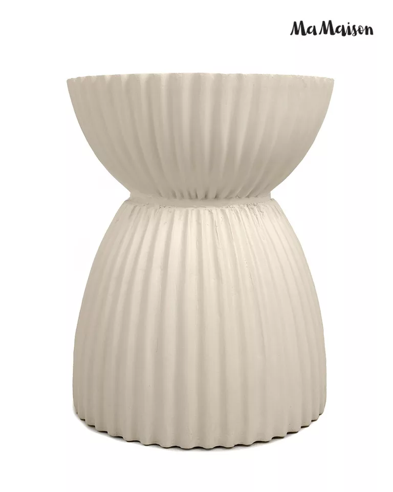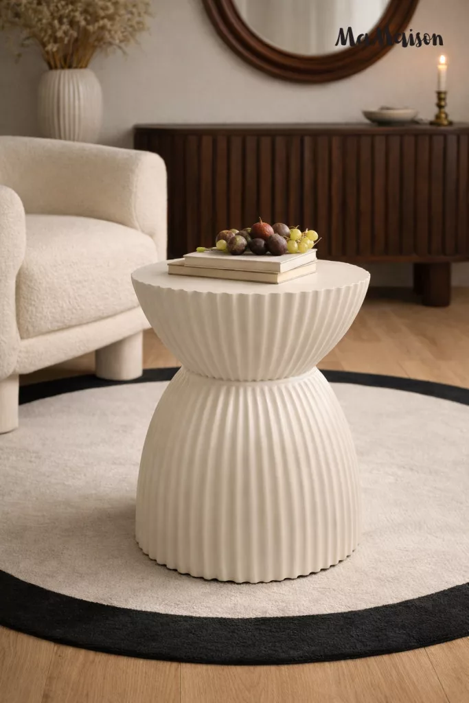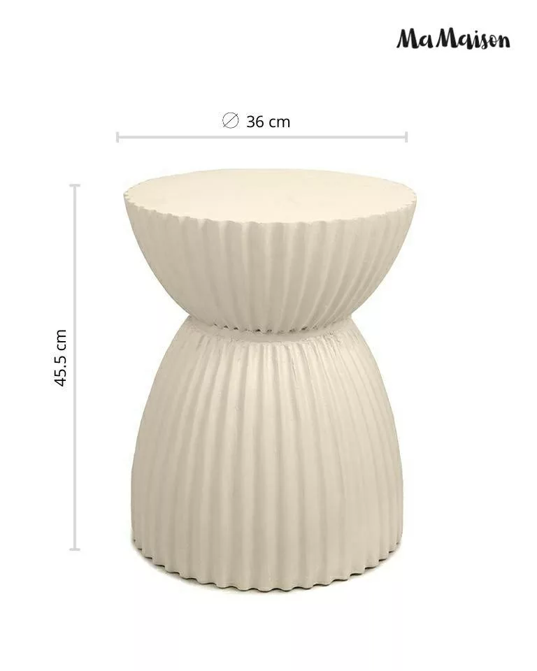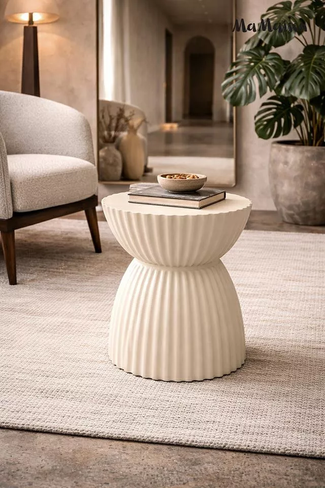 Elegáns, bordázott kialakítású kisasztal, amely művészi formatervezésével és bézs színével tökéletes kiegészítője lehet bármely modern otthonnak.
