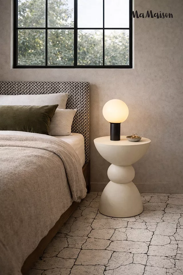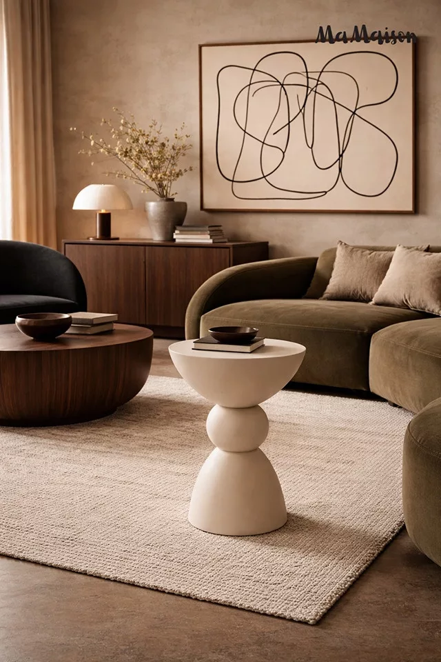 Elegáns, geometrikus formájú kisasztal harmonikus vonalvezetéssel és modern dizájnnal, amely tökéletes kiegészítője a japandi és skandináv stílusú otthonoknak.