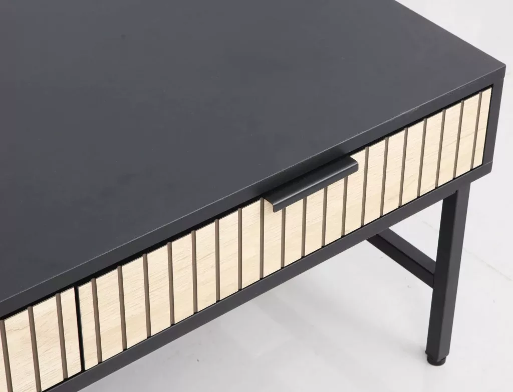 Modern vonalvezetésű dohányzóasztal laminált tölgy és matt fekete színkombinációval, praktikus fiókos kialakítással.
