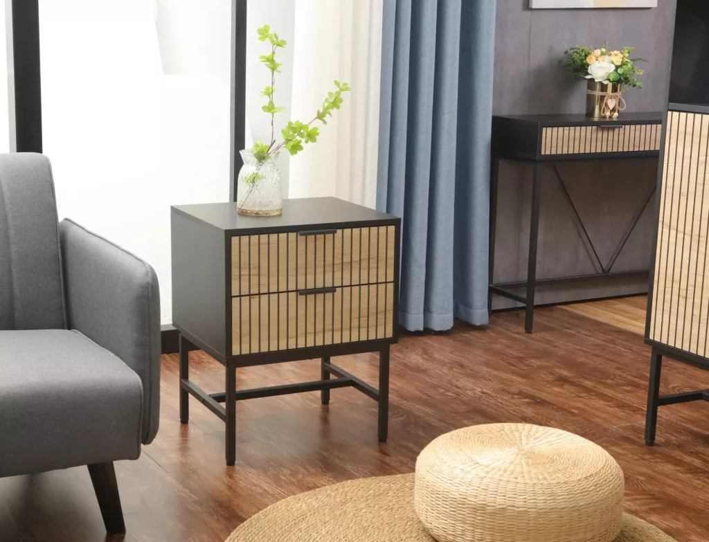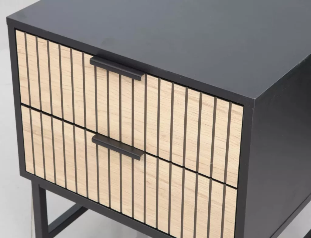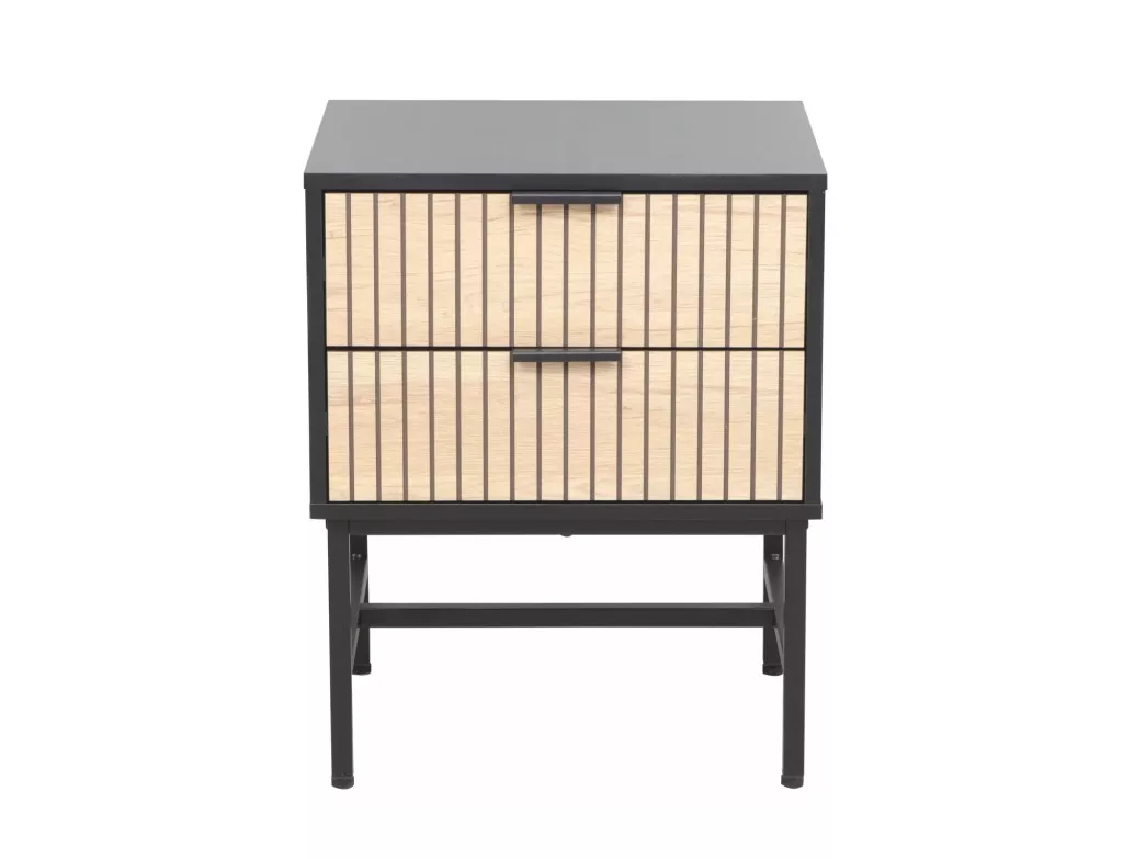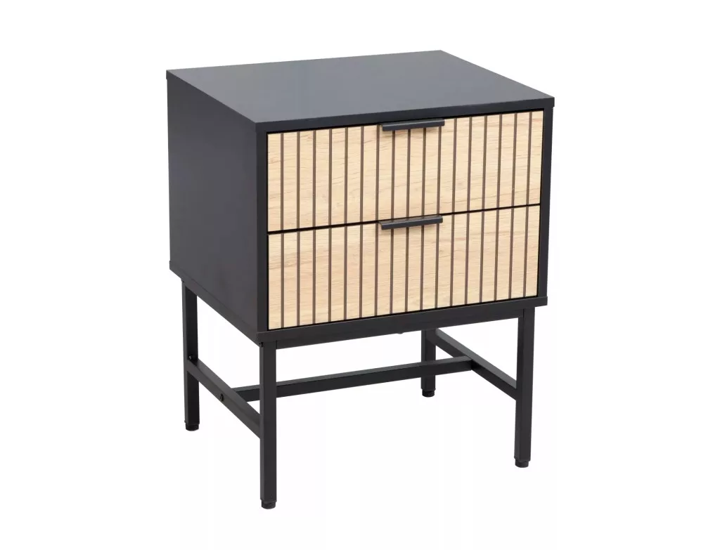 Elegáns, modern éjjeliszekrény két fiókkal, laminált tölgy frontokkal és matt fekete fém vázzal, amely tökéletes kiegészítője a hálószobának.