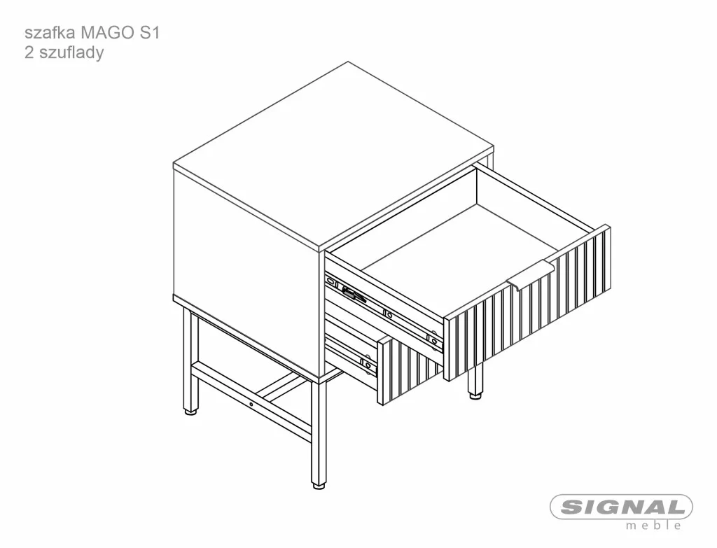 A Mago S1 éjjeliszekrény ötvözi a modern design és a praktikus tárolás előnyeit. A két tágas fiók elegendő helyet biztosít a személyes tárgyak rendszerezett tárolásához, míg a laminált tölgy frontok és a fekete matt keret harmonikus kontrasztot alkotnak.