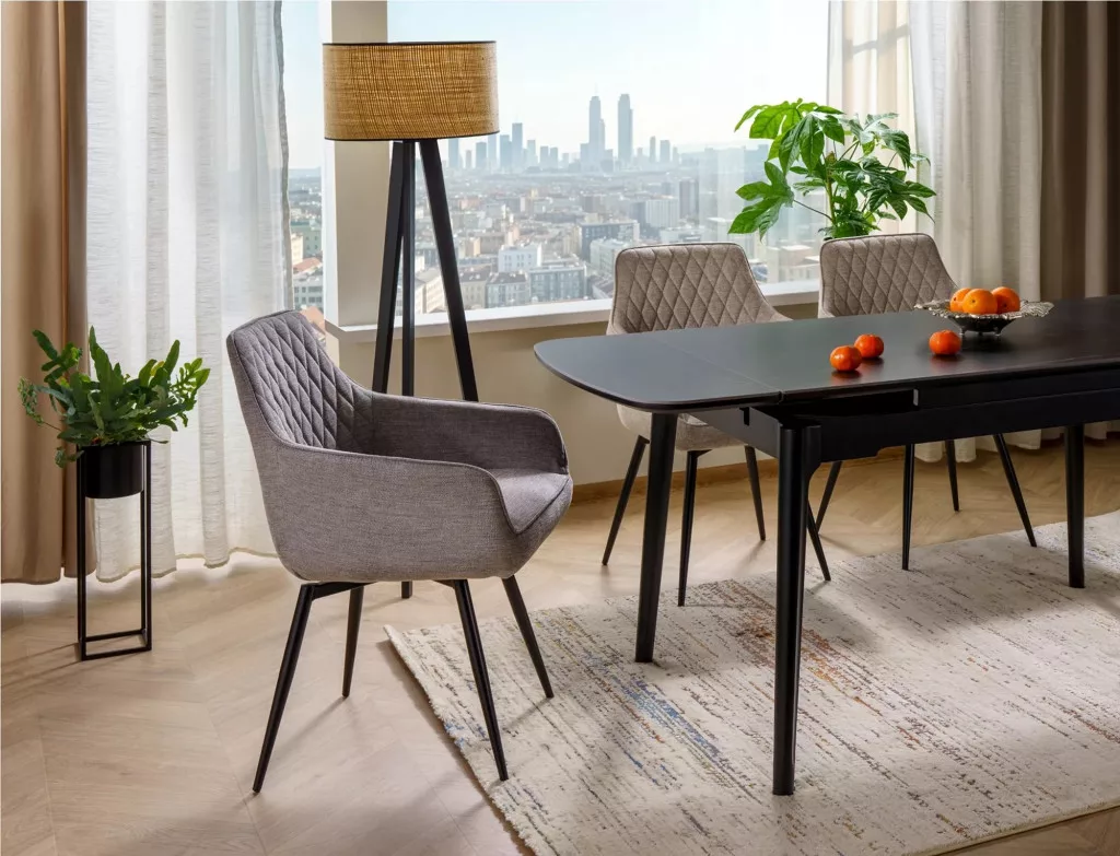 A Marlo Brego étkezőszék tökéletesen ötvözi a modern dizájnt és a funkcionalitást. A steppelt, bézs szövetkárpitozás és a karfás kialakítás páratlan kényelmet biztosít, míg a matt fekete fém váz stabil alapot és időtlen megjelenést kölcsönöz a széknek.